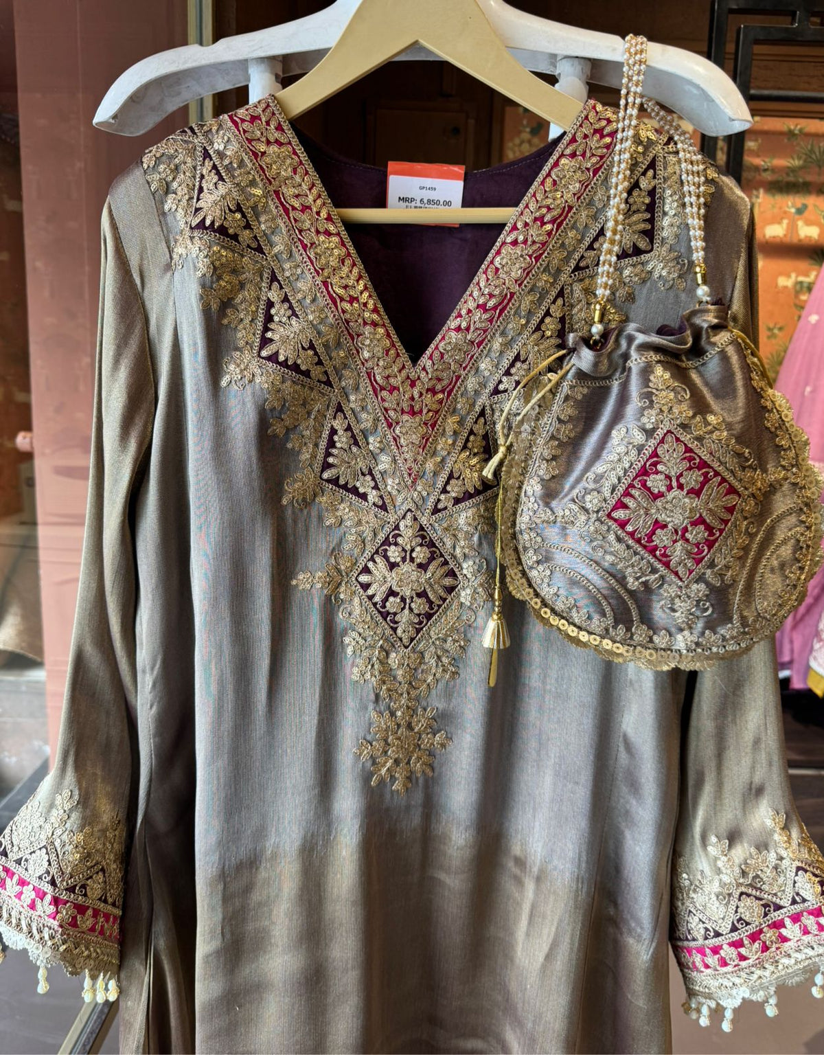 Embellishments include gold threadwork, sequins, and Dori work detailing
