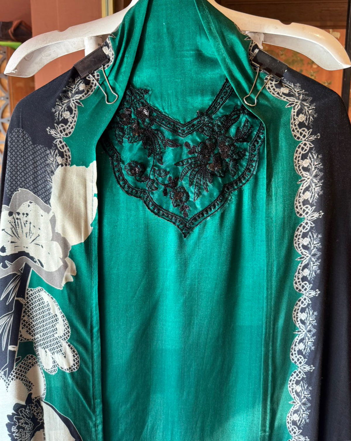 Intricate thread embroidery in contrast tone forming a graceful neckline motif.
