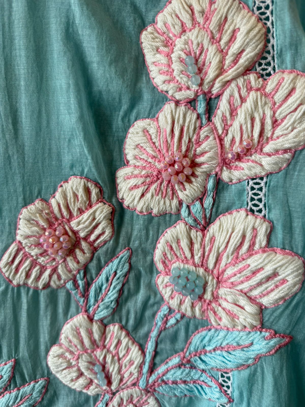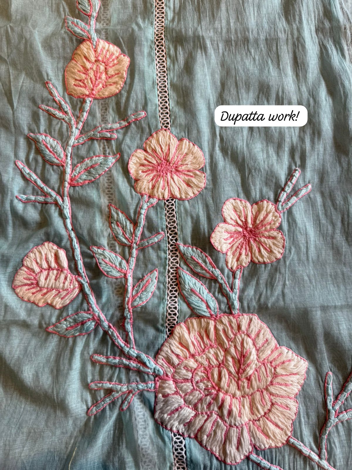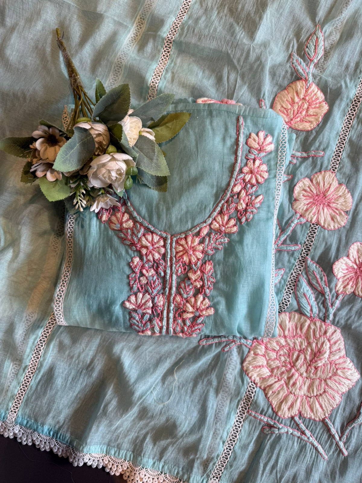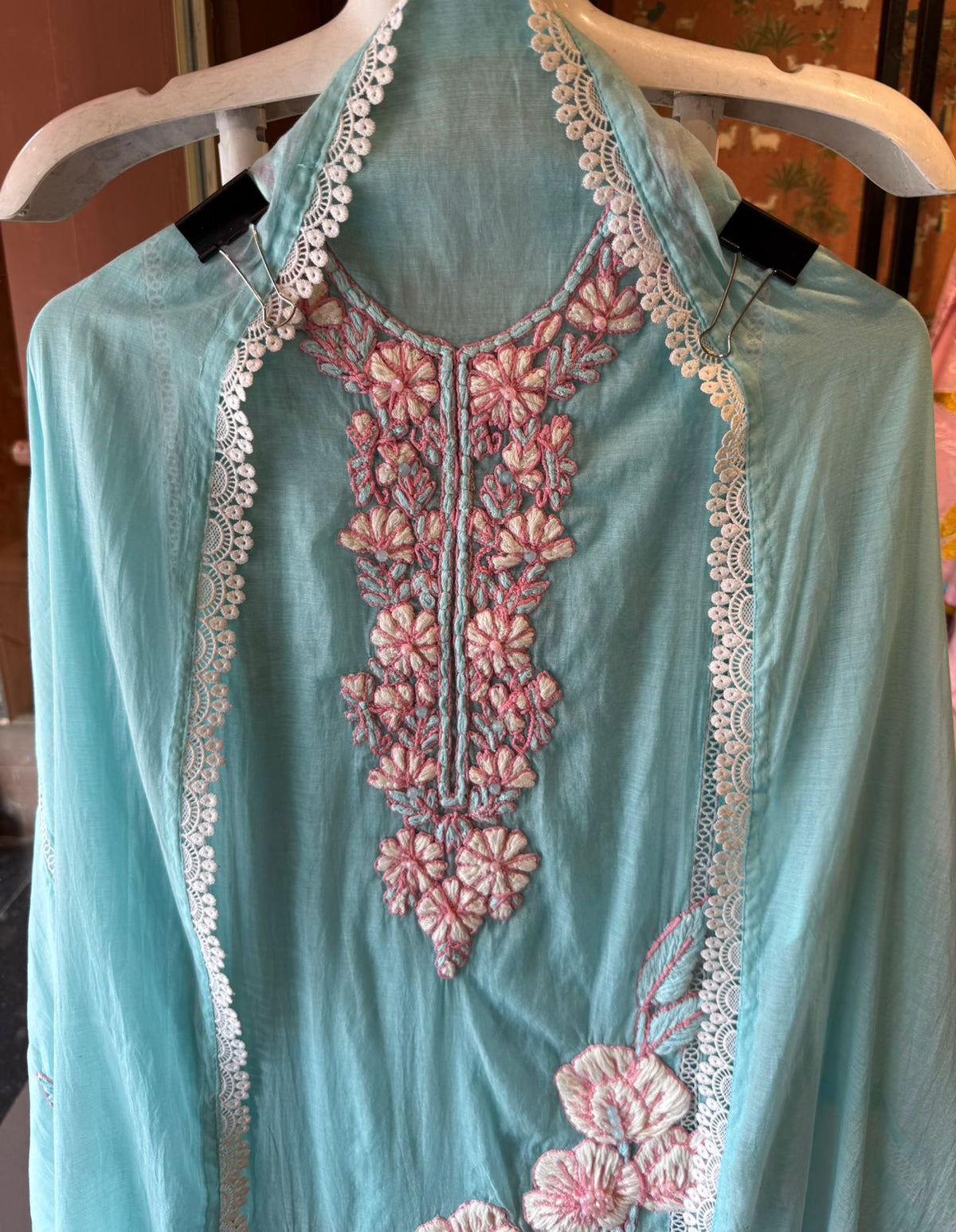 Soft pastel aqua base On Mul chanderi fabric with a smooth, lightweight flow.