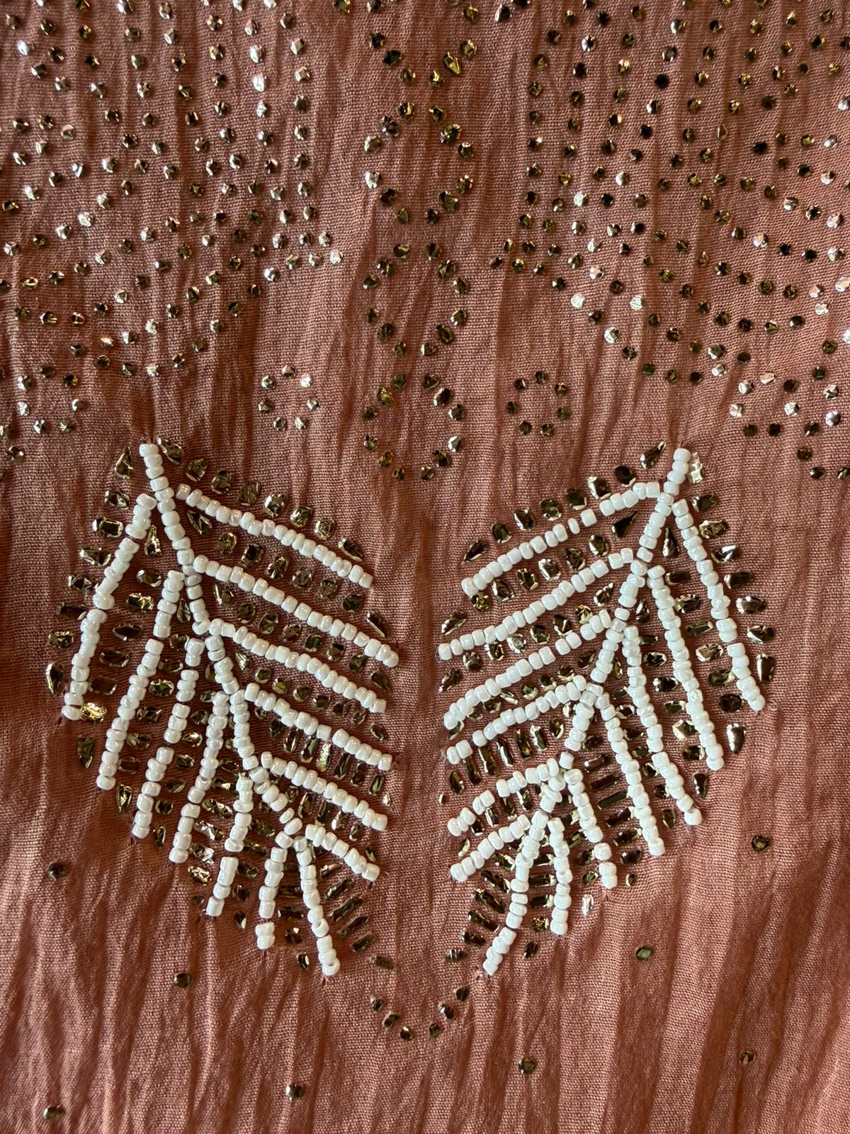 Neckline featuring subtle pearl and bead detailing arranged in geometric and leaf-inspired patterns.