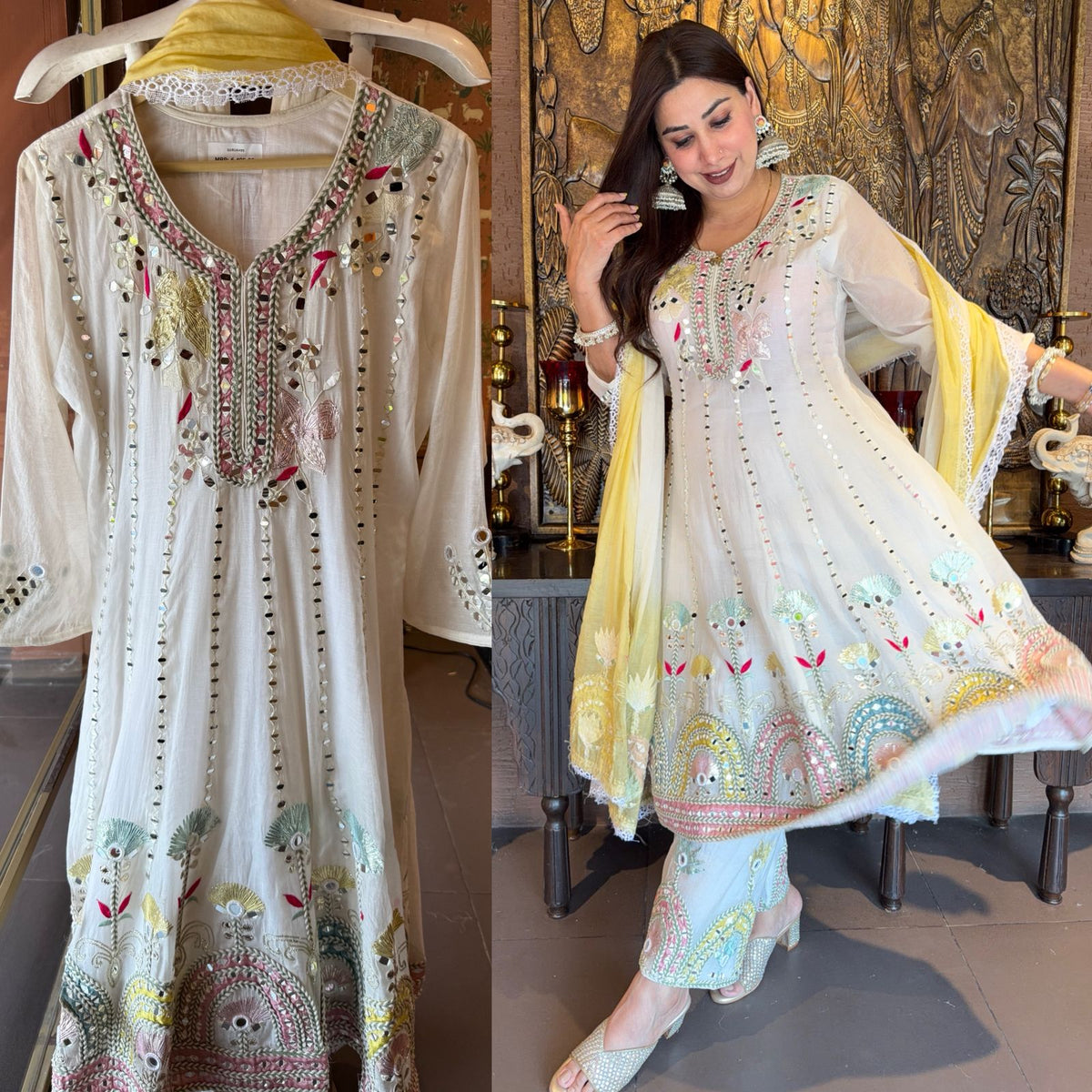 A dreamy festive outfit featuring delicate multicolor thread embroidery inspired by floral garden motifs.