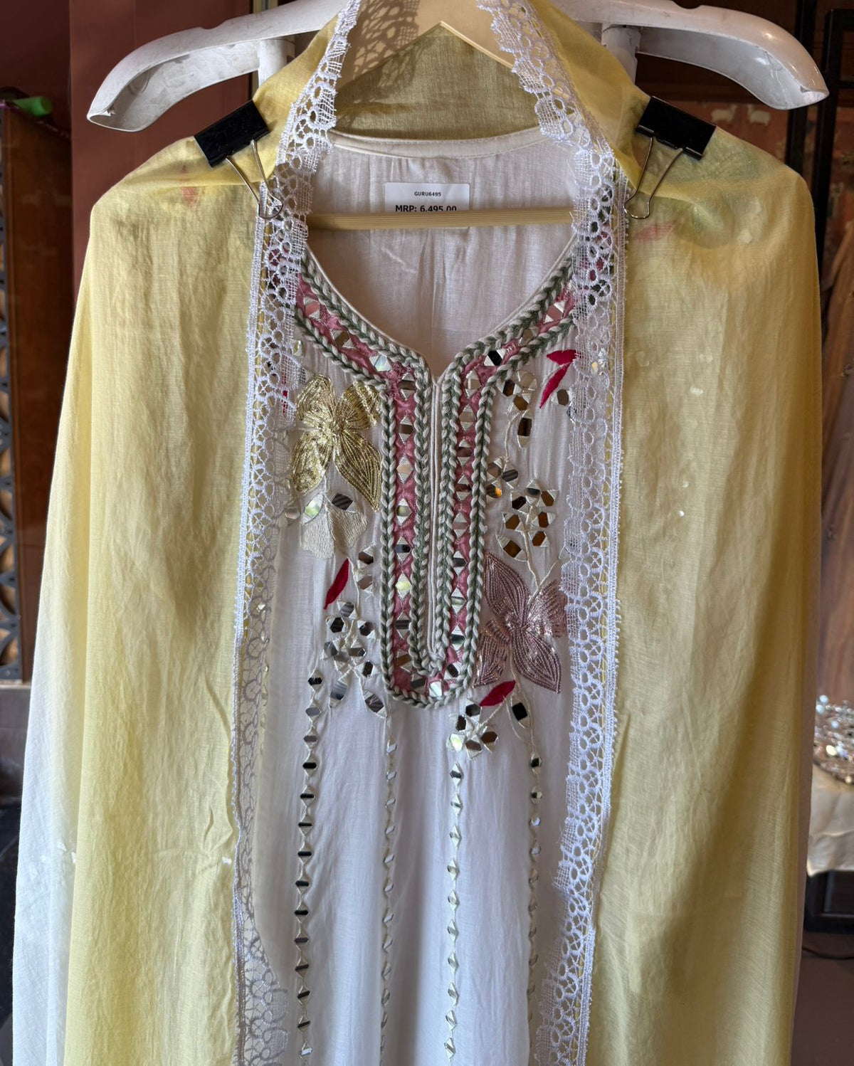 The Shirt is beautifully detailed with fine mirror accents and intricate neckline work, paired with a soft coordinated dupatta finished with lace edges.