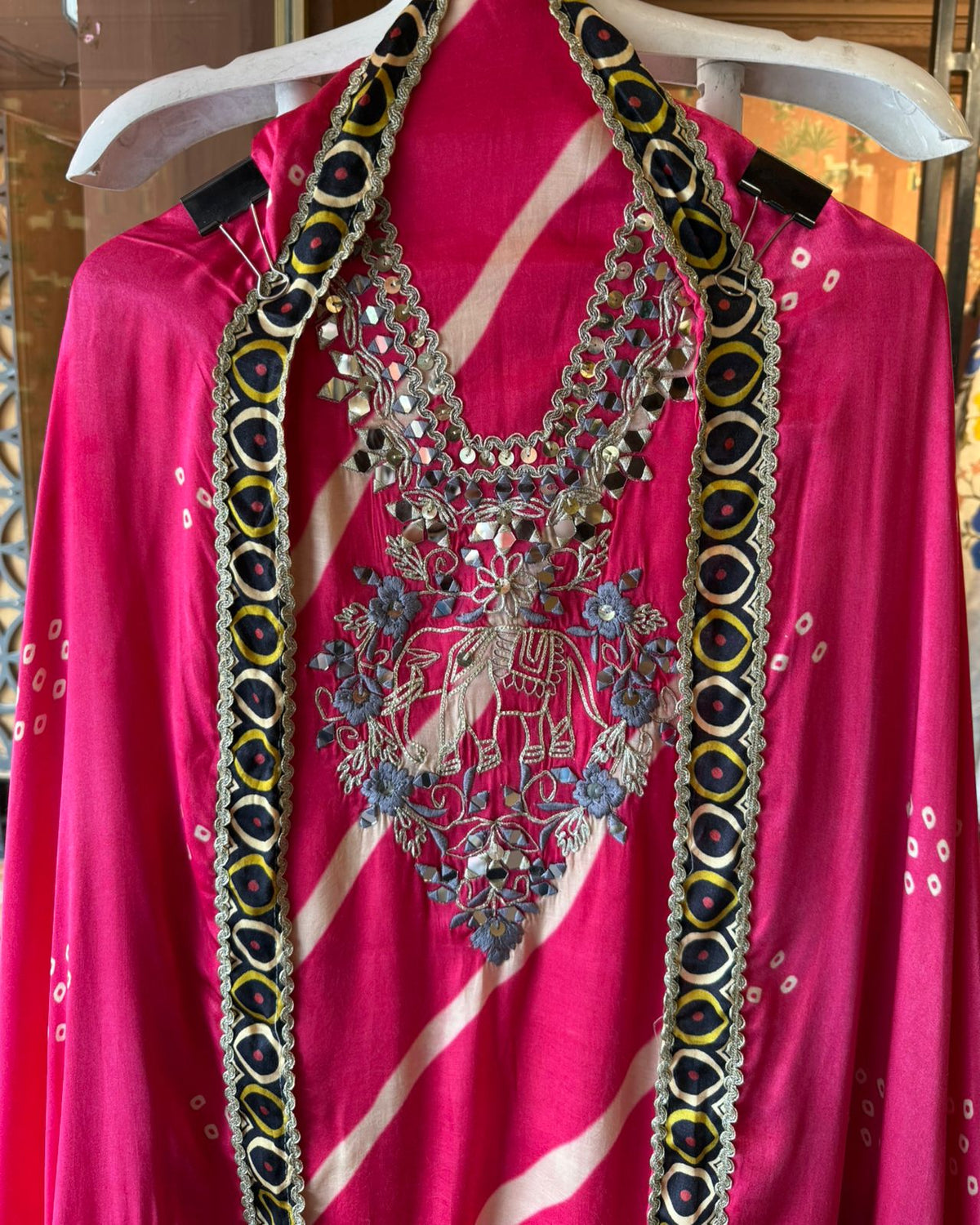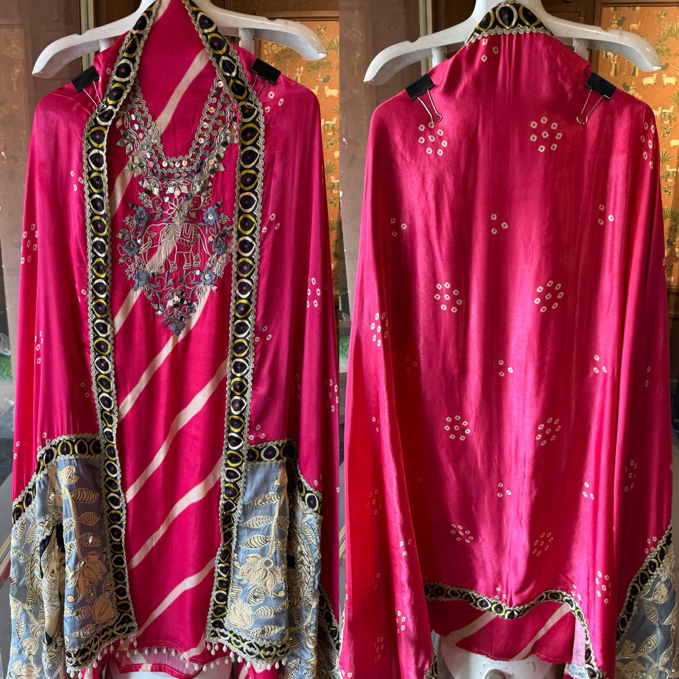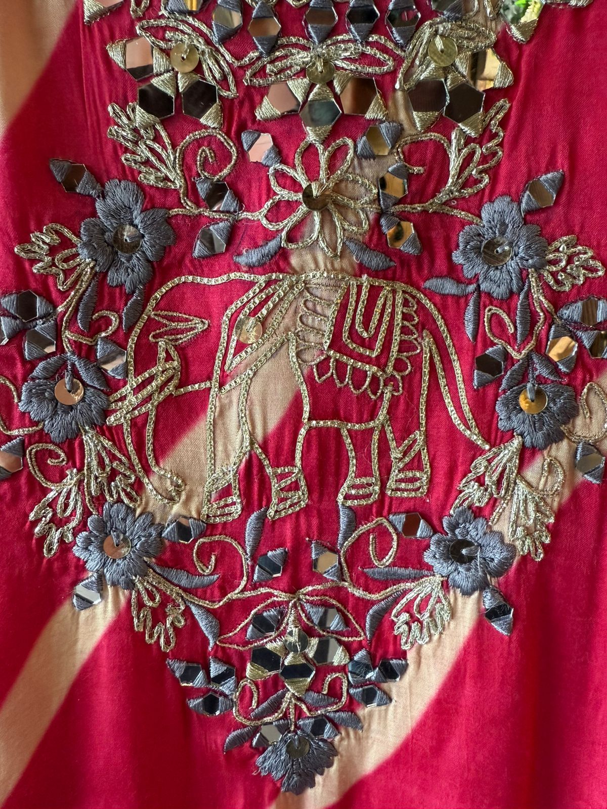 The piece combines mirror work, gota work, thread embroidery, and bandhani-style dot patterns.