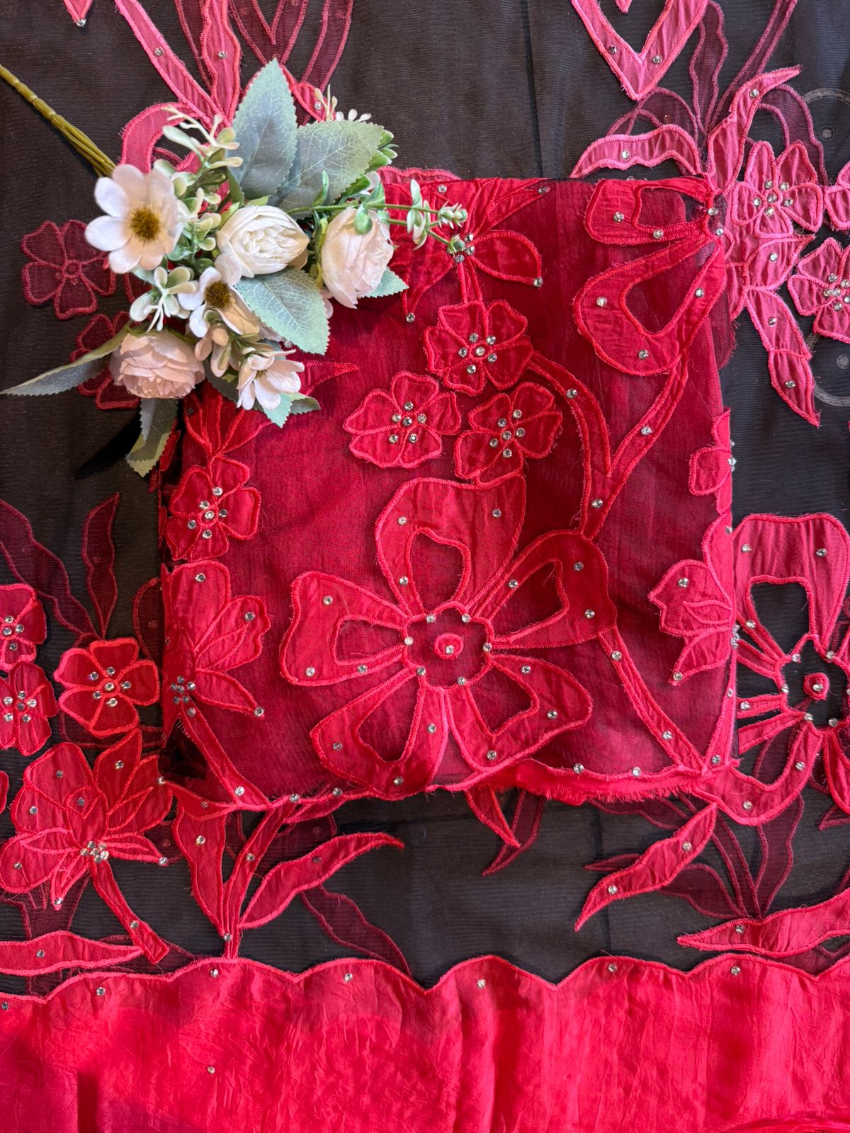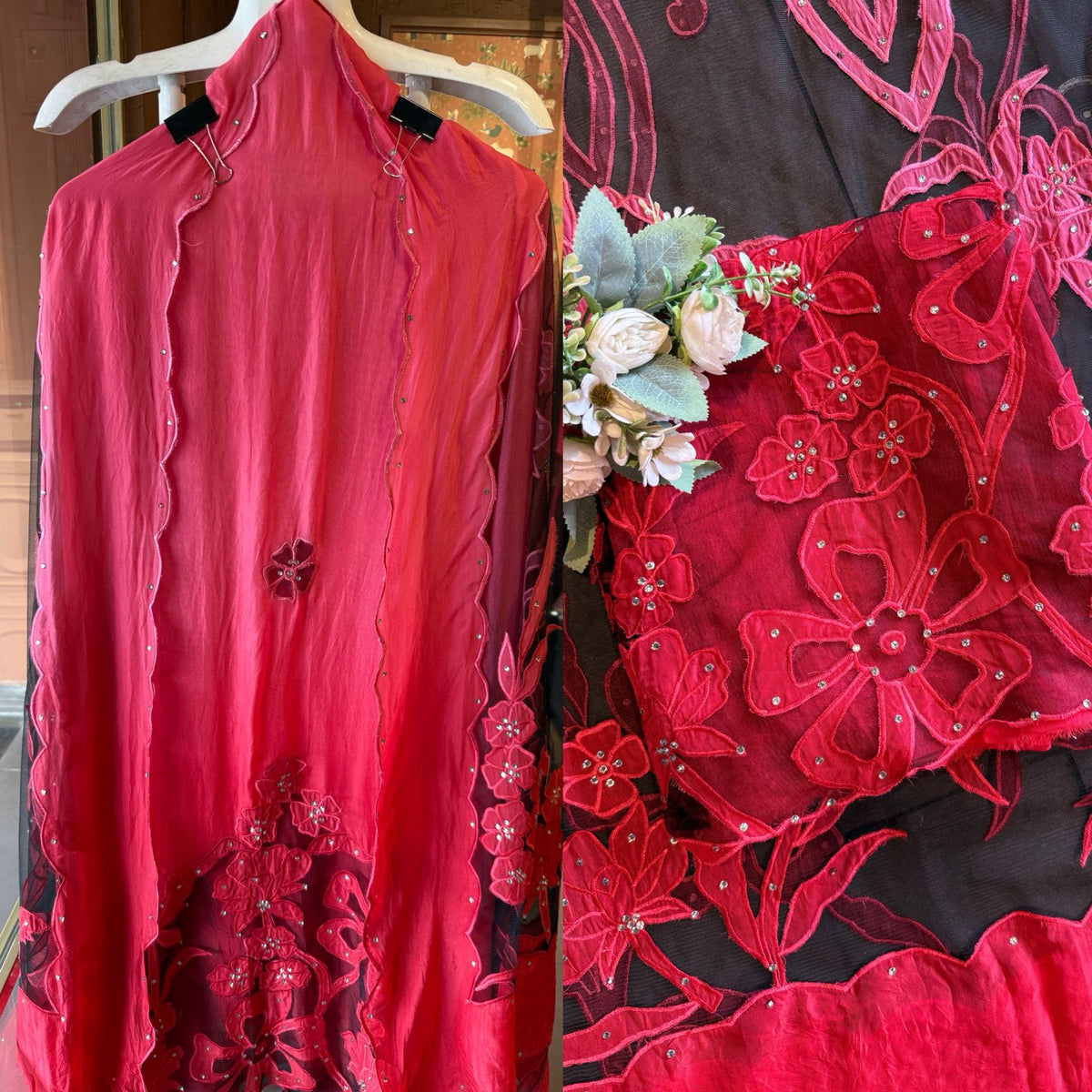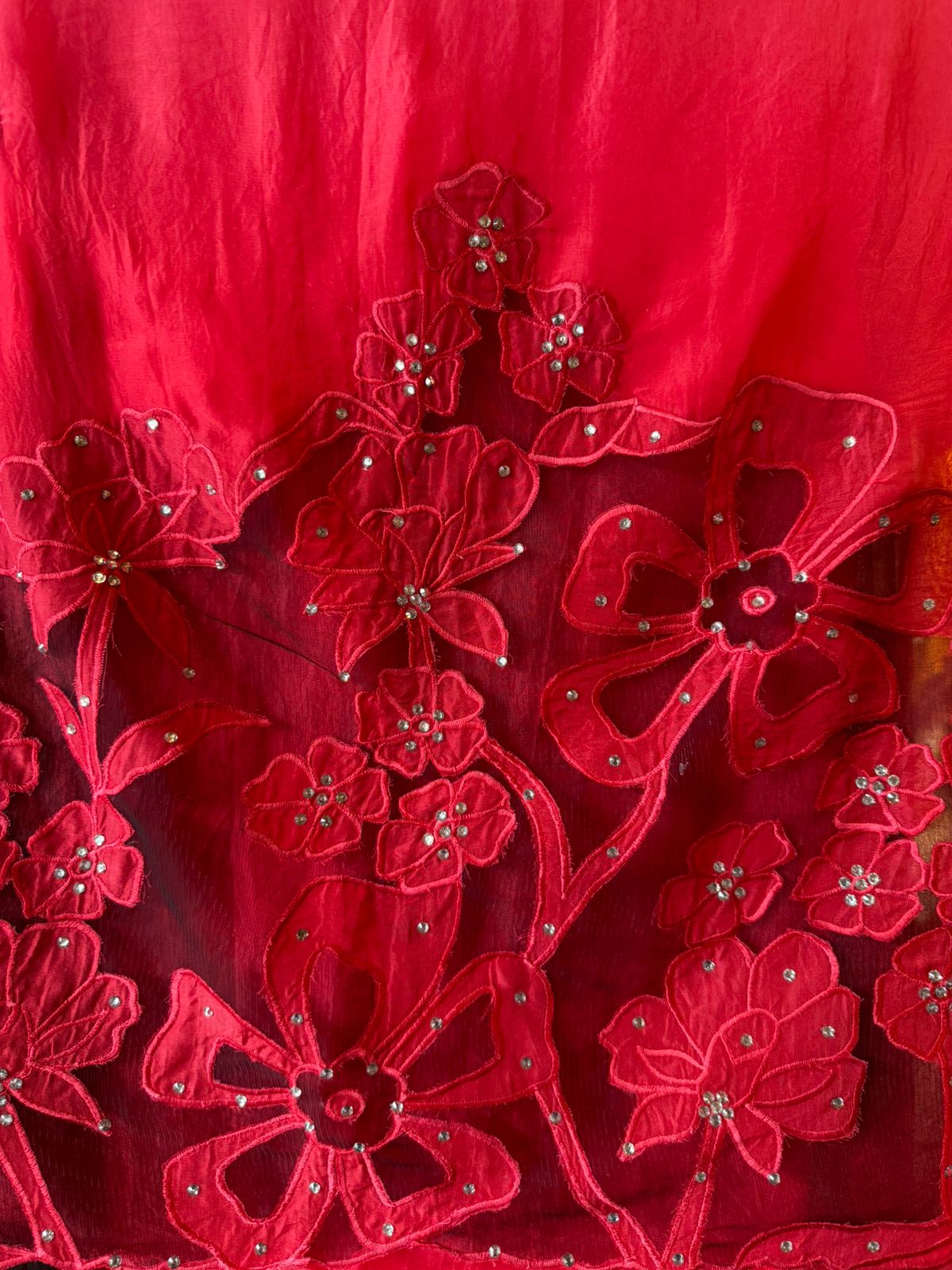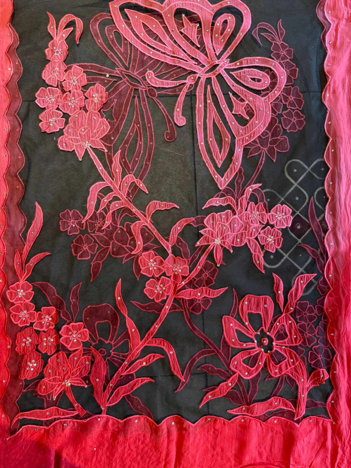 Ombré shaded organza dupatta with appliqué  work done with the help of net fabric .