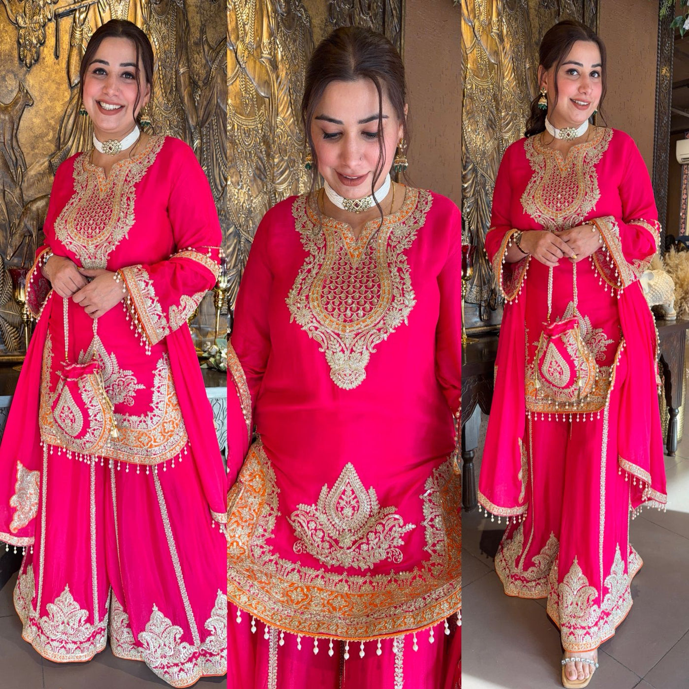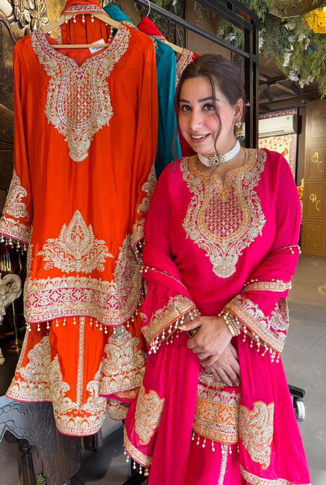 The sharar’s are fully heavily embroidered with Dori and Zari work.