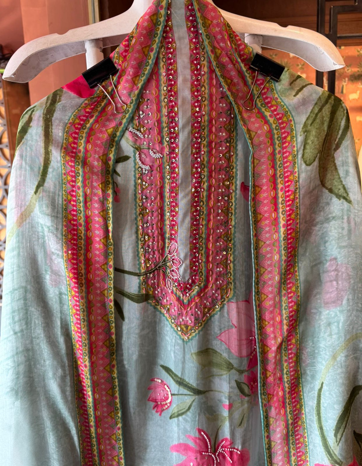 Neckline with an elongated embroidered yoke with Fine bead / sequin handwork running vertically