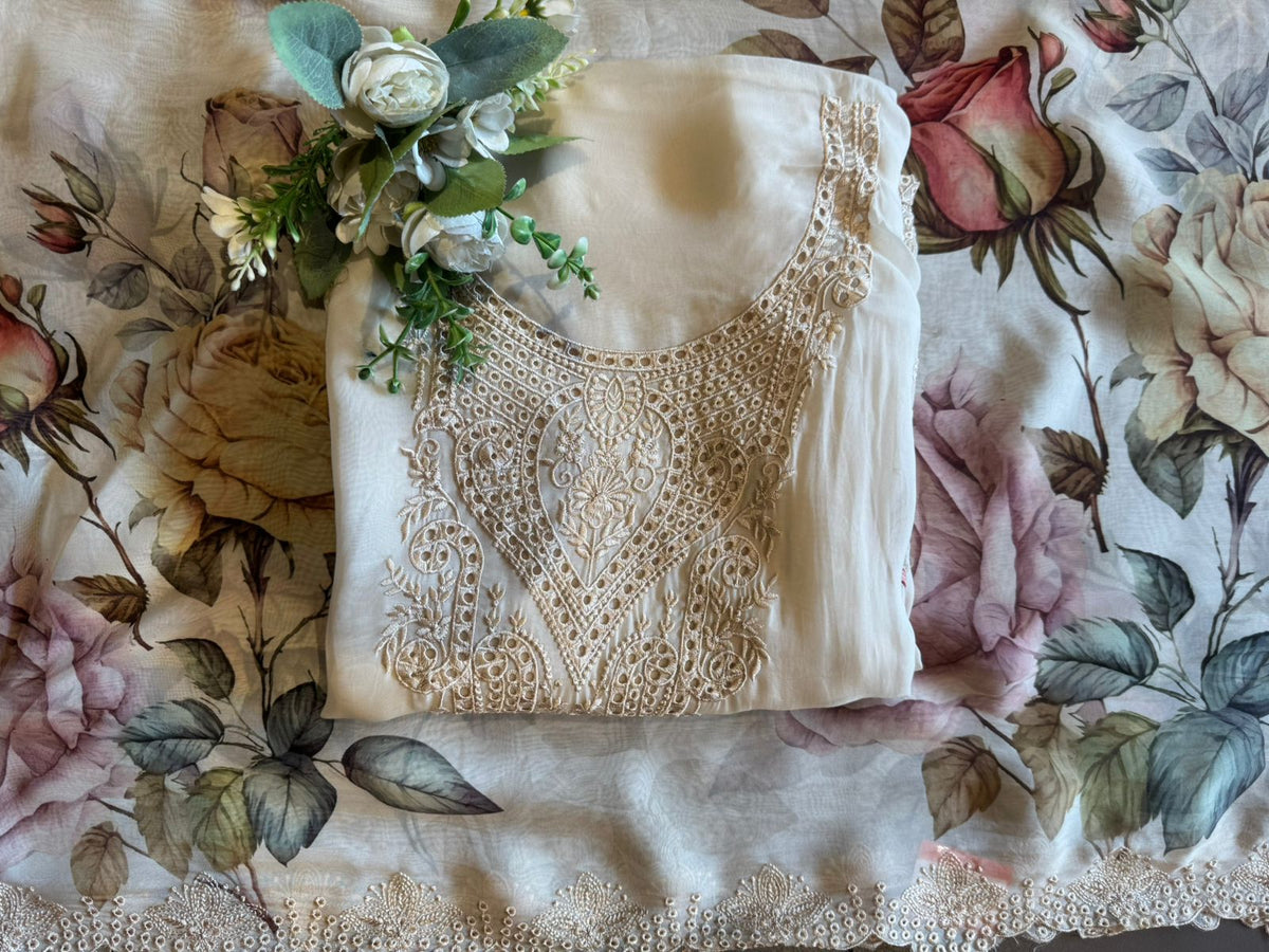 Organza Unstitched Suit set with Coloured Threadwork ( It has a straight, relaxed silhouette)