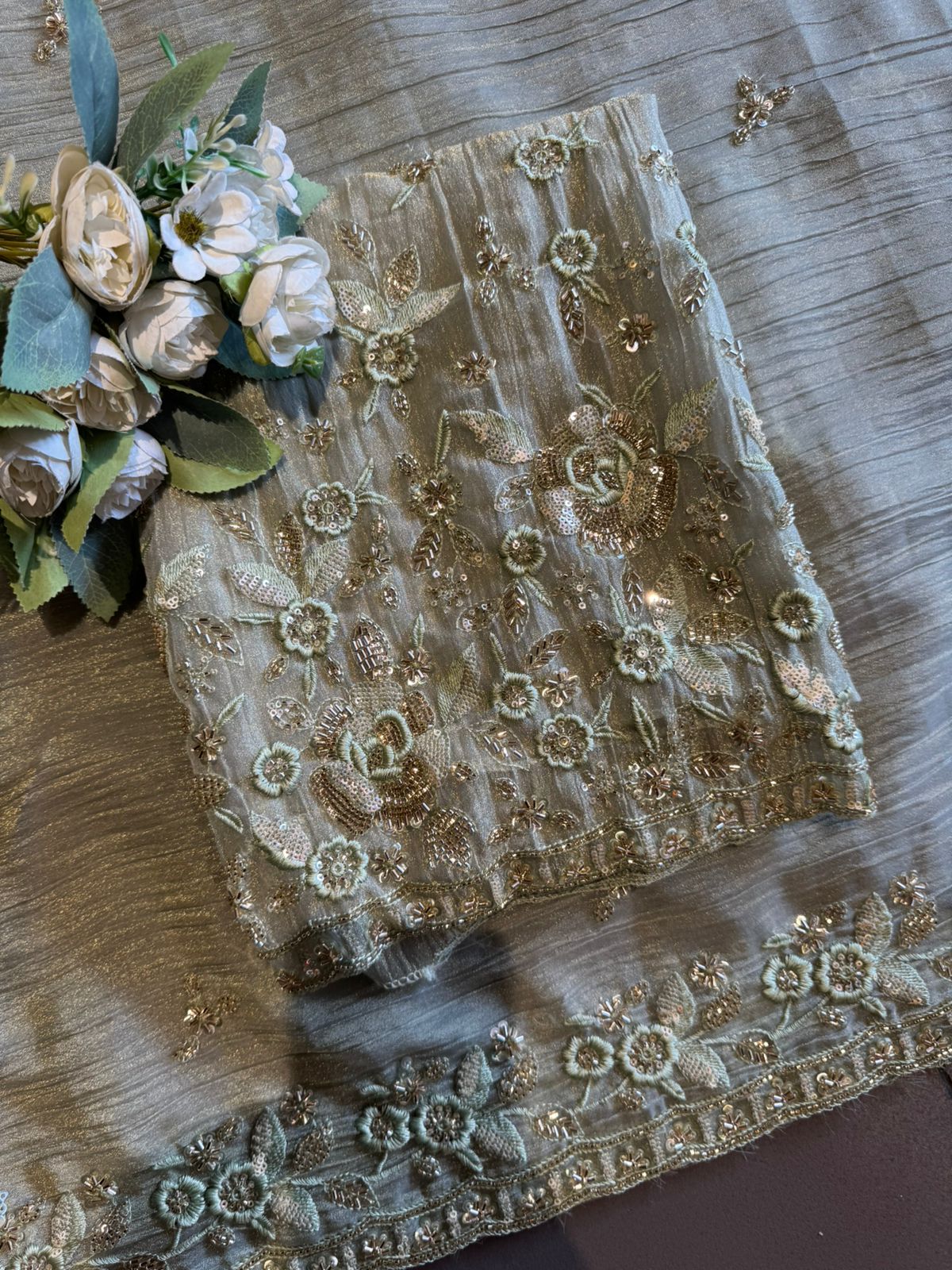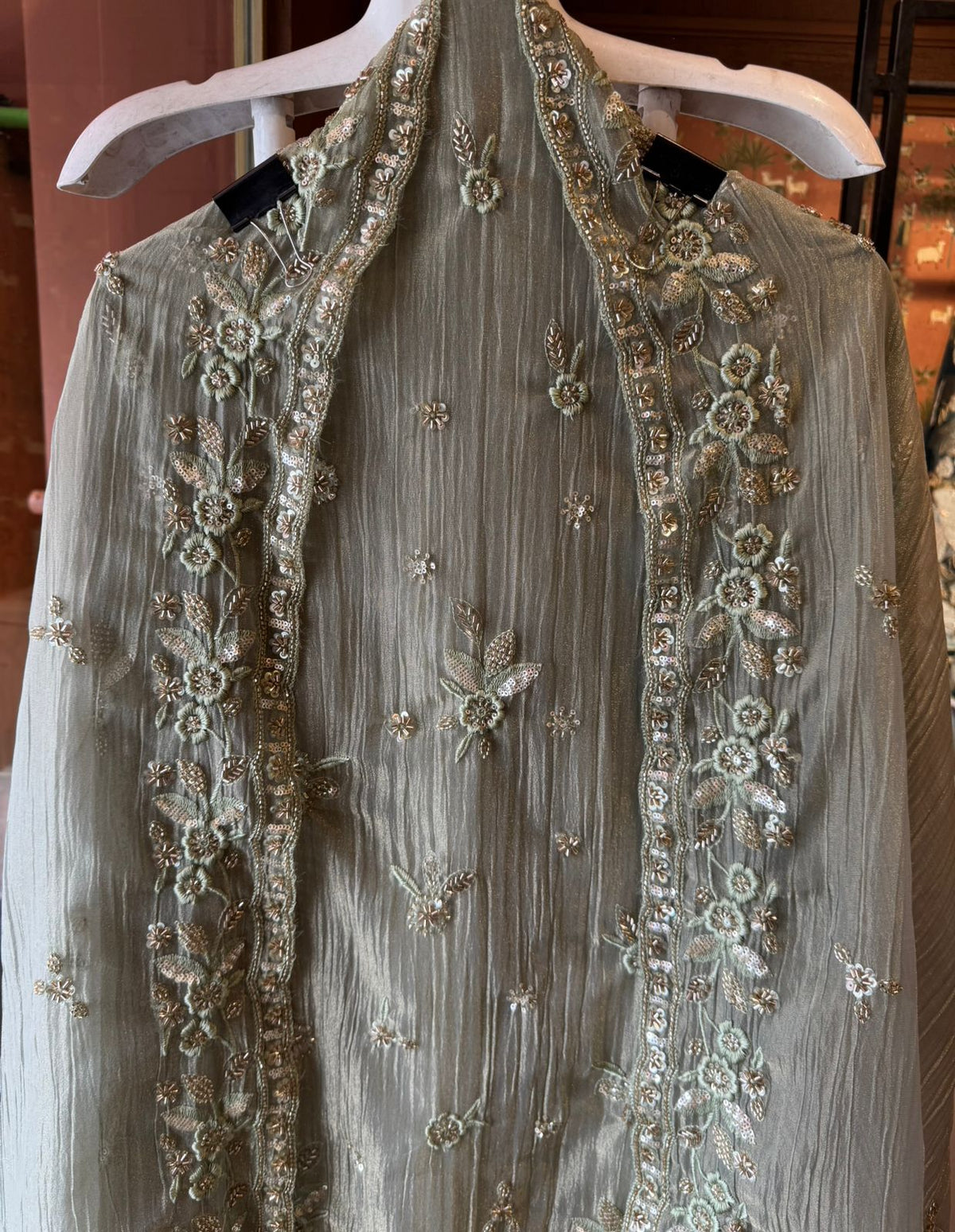 Crushed tissue  dupatta with handwork booties on the full dupatta with heavy pearl embellished border.