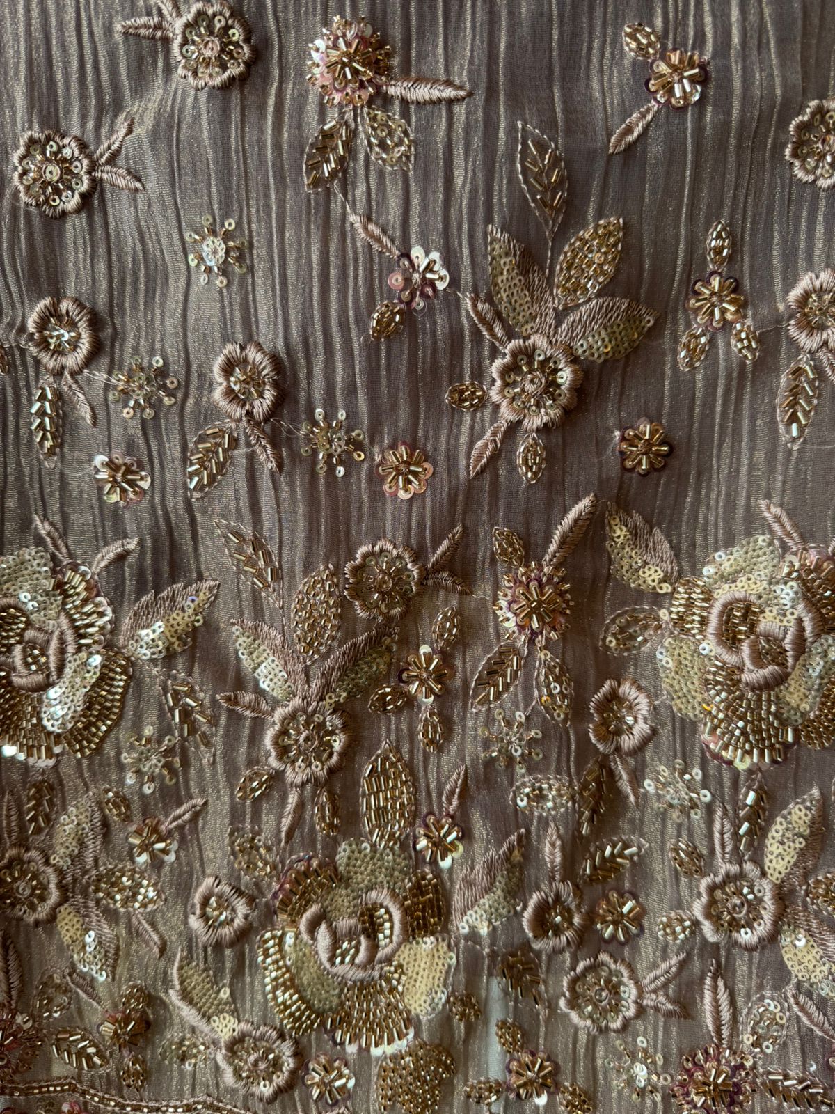 Crushed tissue  dupatta with handwork booties on the full dupatta with heavy pearl embellished border.