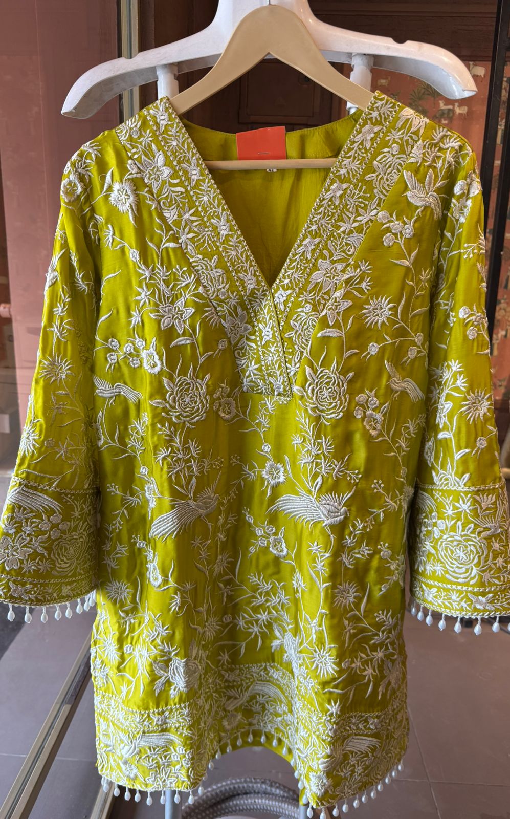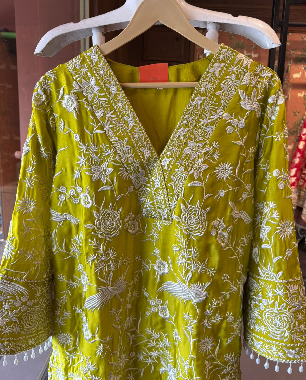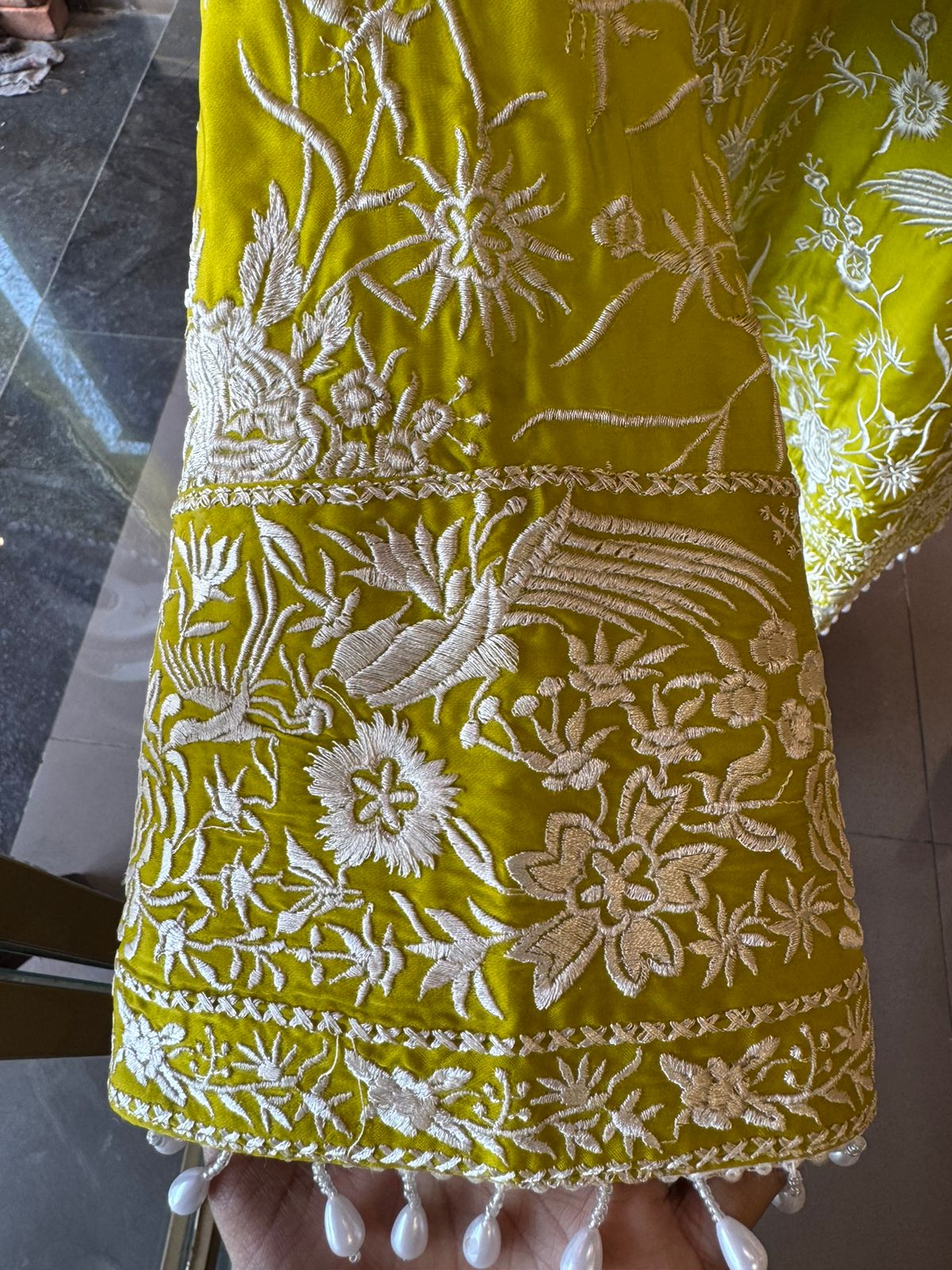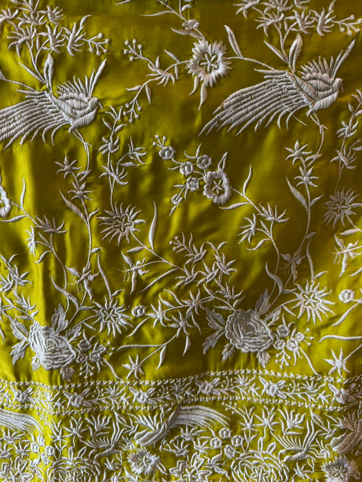 Work: Intricate all-over white thread hand embroidery featuring floral & bird motifs for a rich handcrafted look