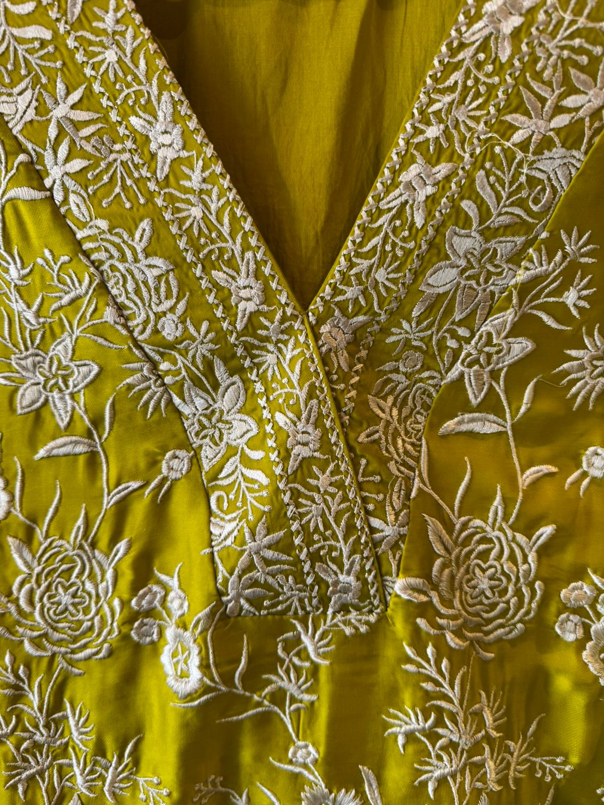 Neckline: Elegant V-neck panel with detailed embroidery finishing