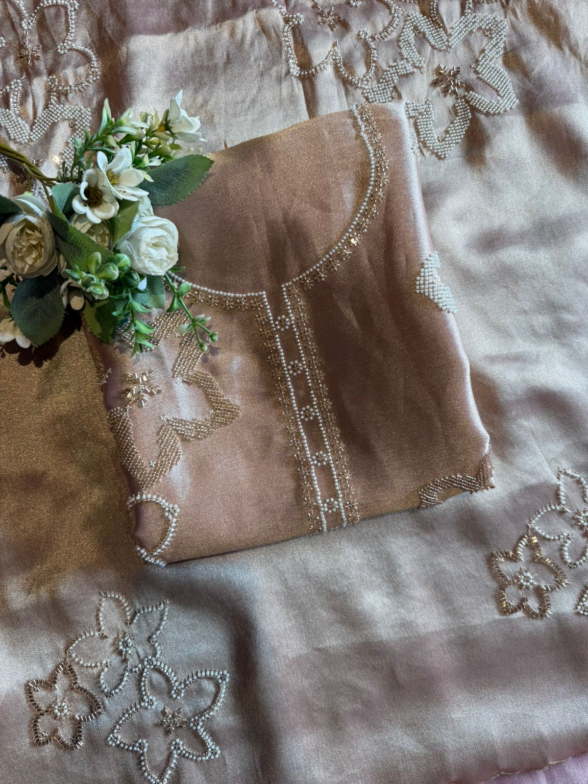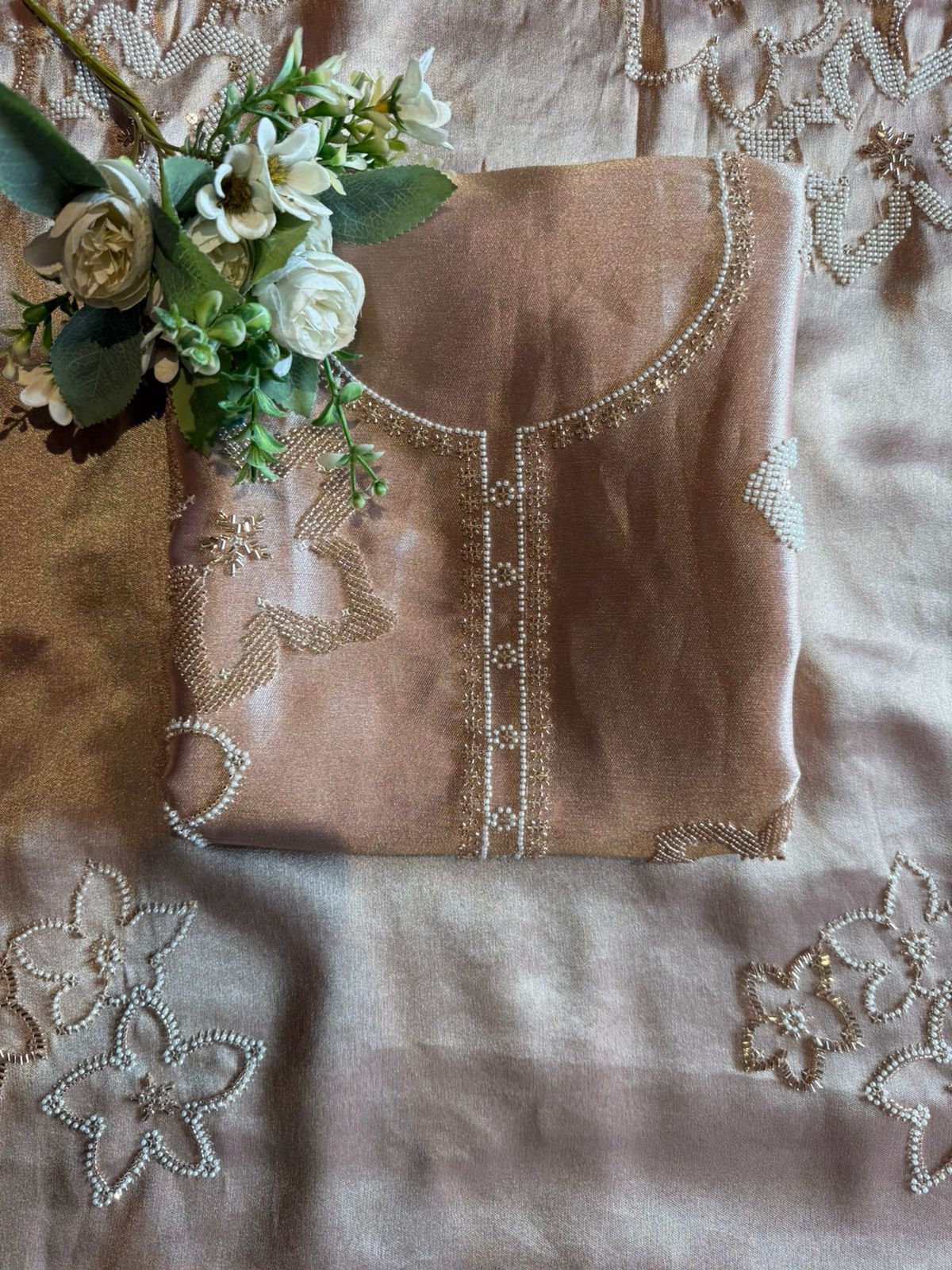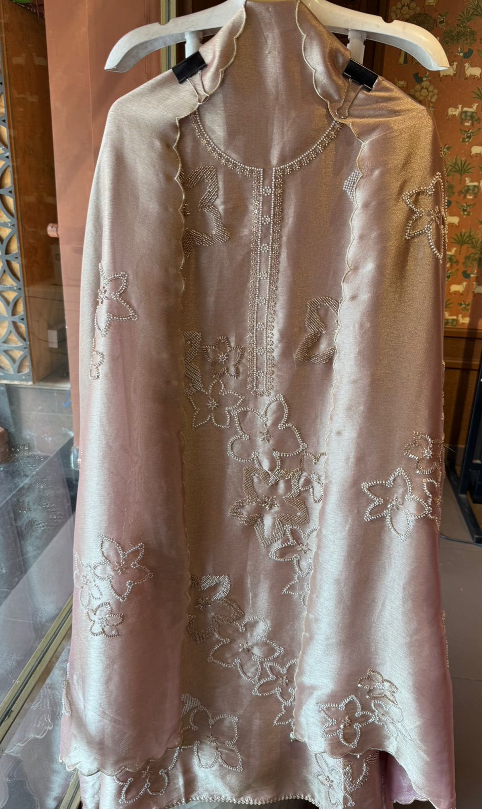 The shirt front has Beautiful floral design which is designed with pearls/Beads/Nalki and Cutdana.