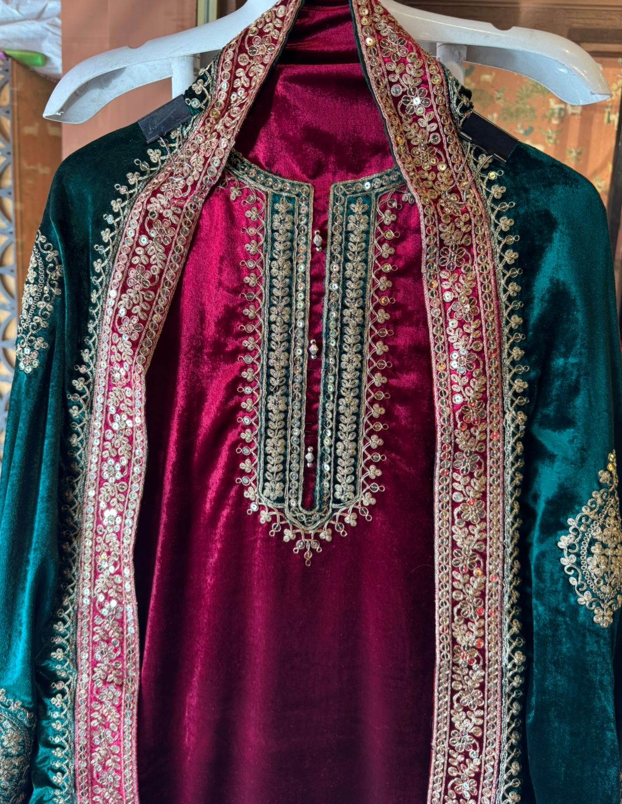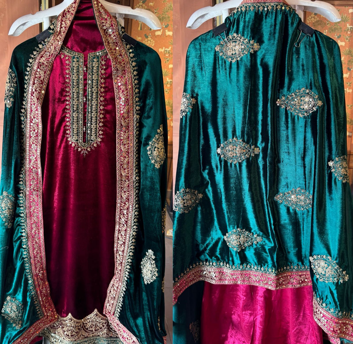 Velvet bottoms with Intricate embroidery Of Zari and Dori with with Sippi highlighting.