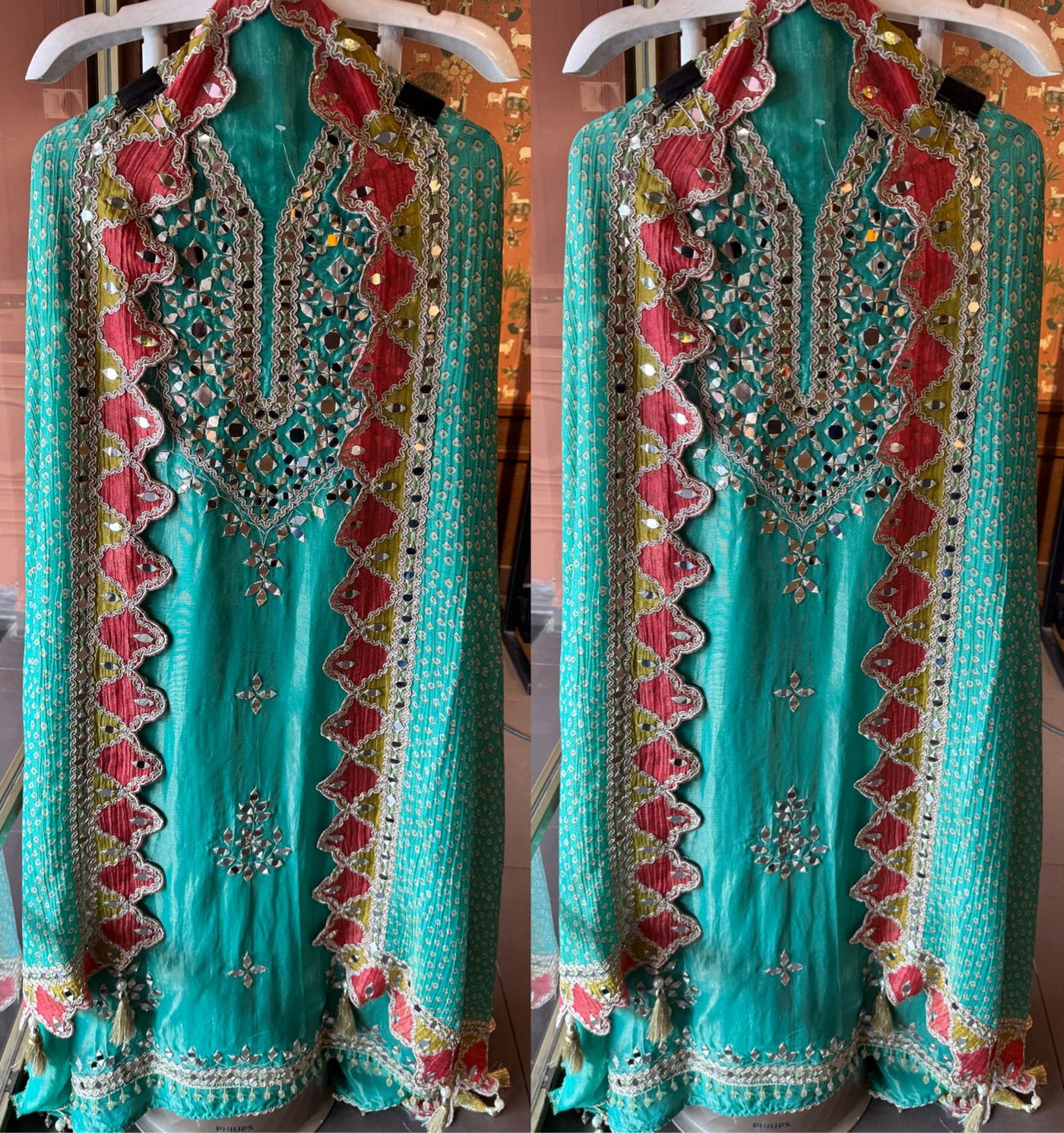 The suit is absolutely beautiful and Graceful , Amazing concept of the dupatta. Looks Vibrant, artisanal, and festive — perfect for mehendi functions, daytime weddings, or cultural celebrations