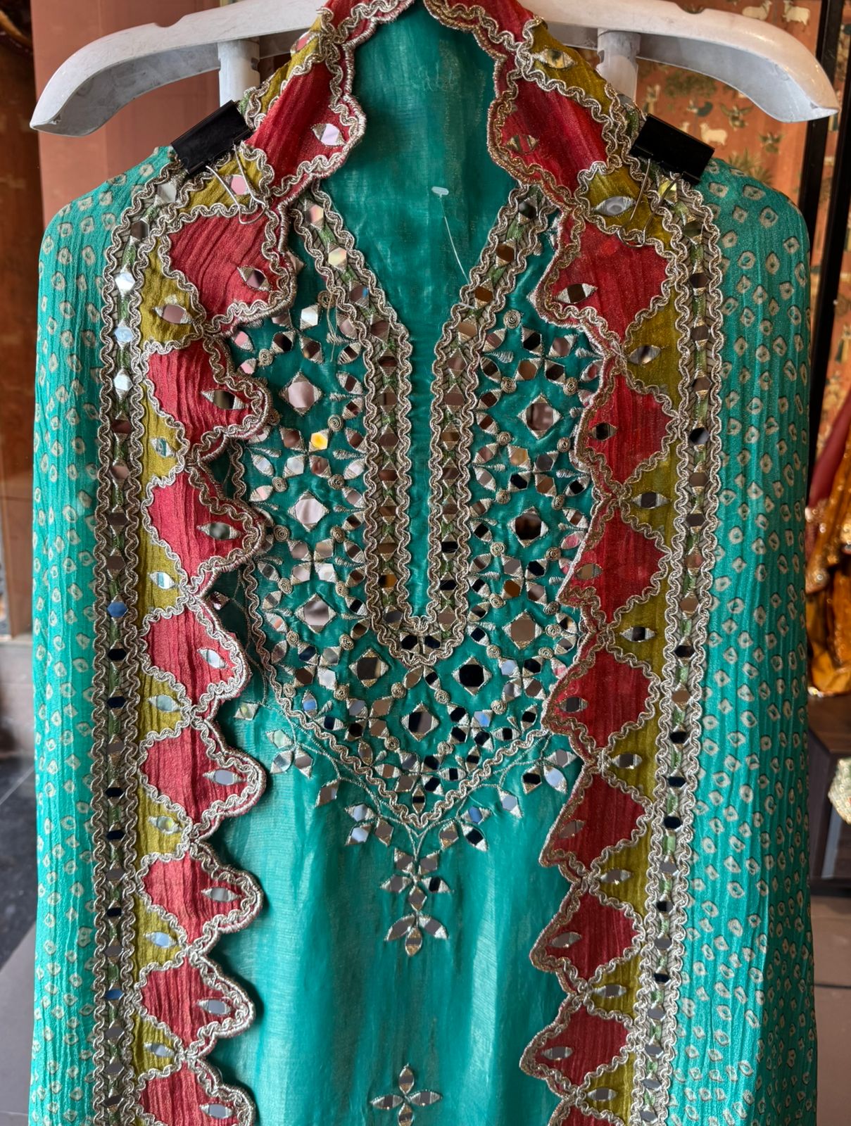 With heavily embroidered neckline with Zaid laces and mirror work.