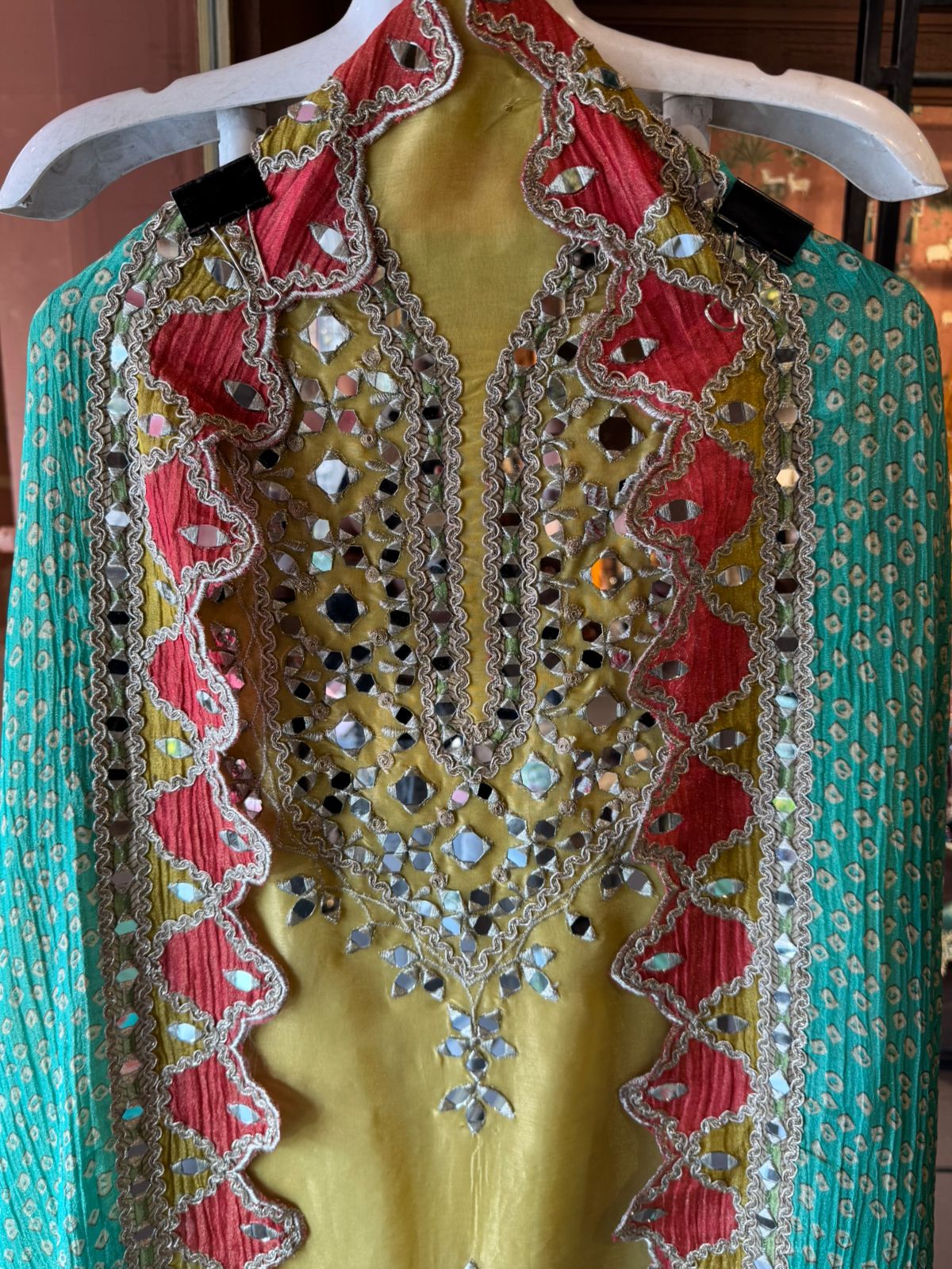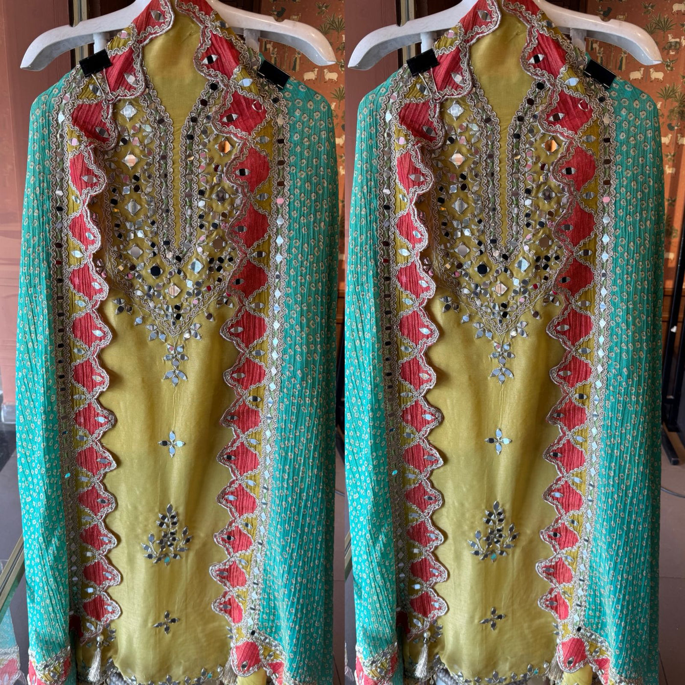 The suit is absolutely beautiful and Graceful , Amazing concept of the dupatta. Looks Vibrant, artisanal, and festive — perfect for mehendi functions, daytime weddings, or cultural celebrations