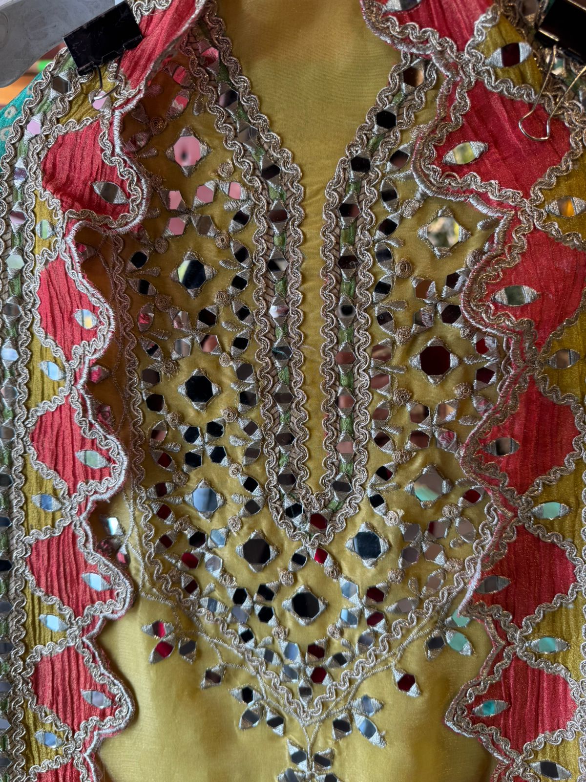 With heavily embroidered neckline with Zaid laces and mirror work.