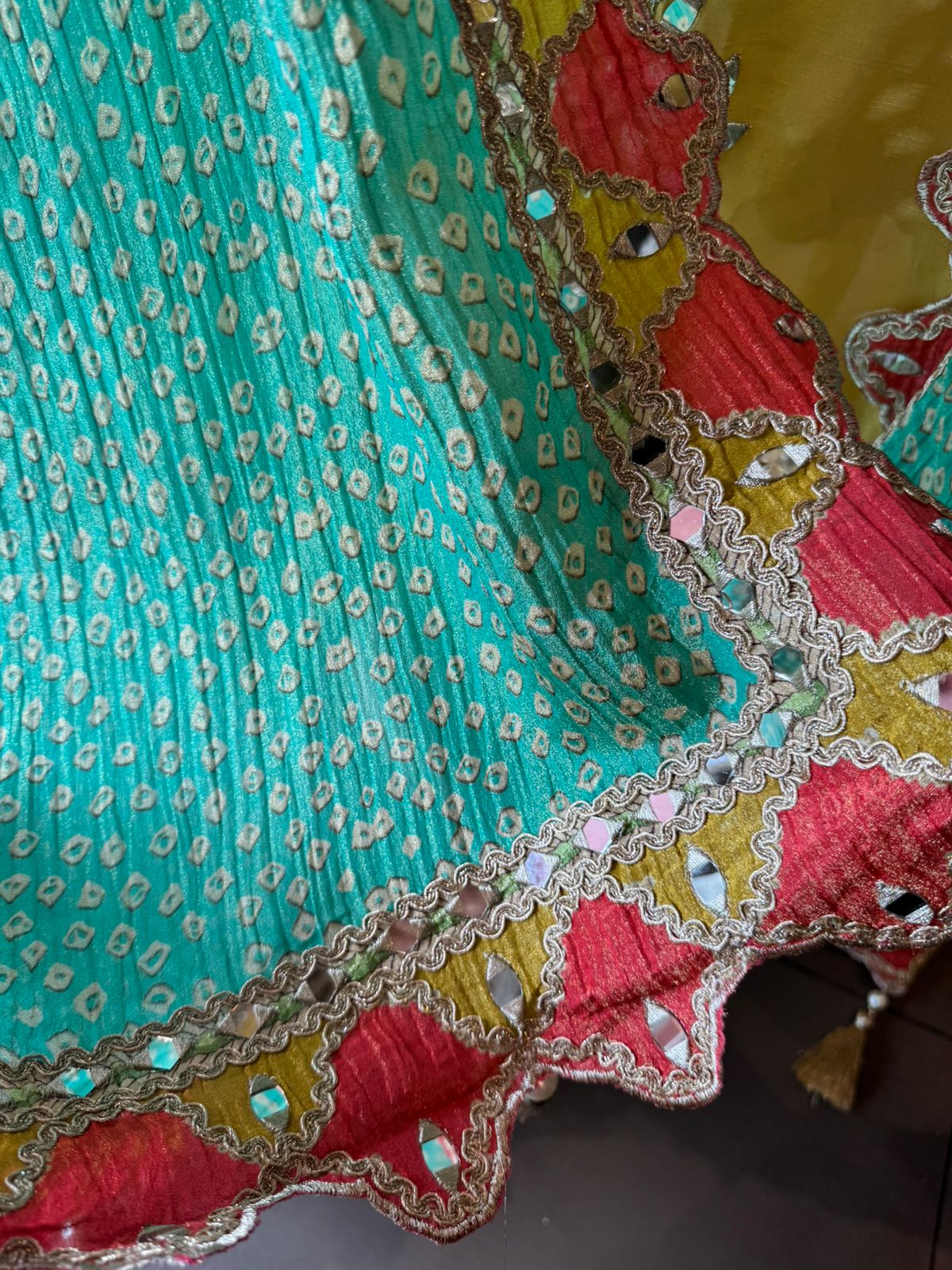 Crushed tissue bandhani dupatta with Cutwork borders on the four sides with gotta work and mirror work detailings on the borders.