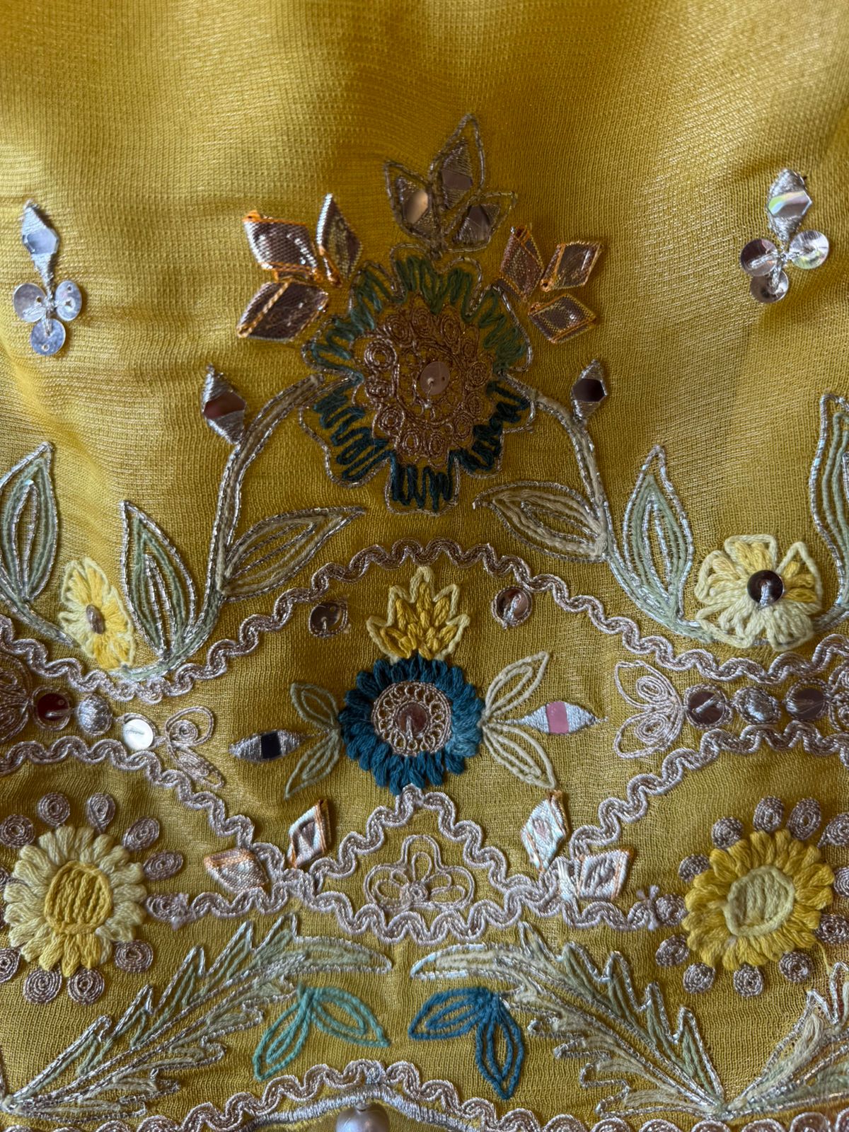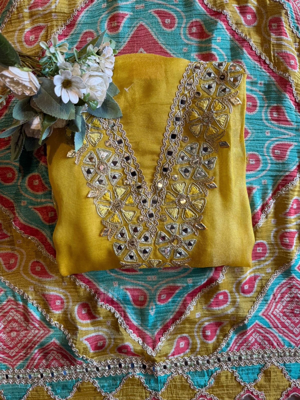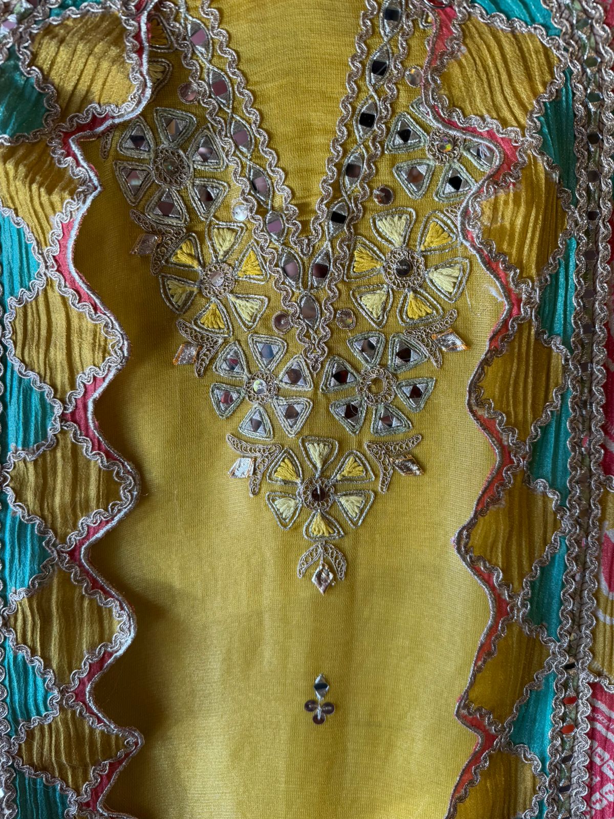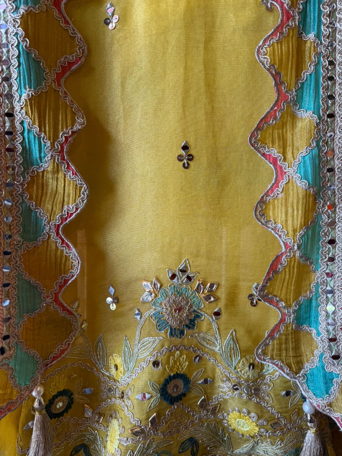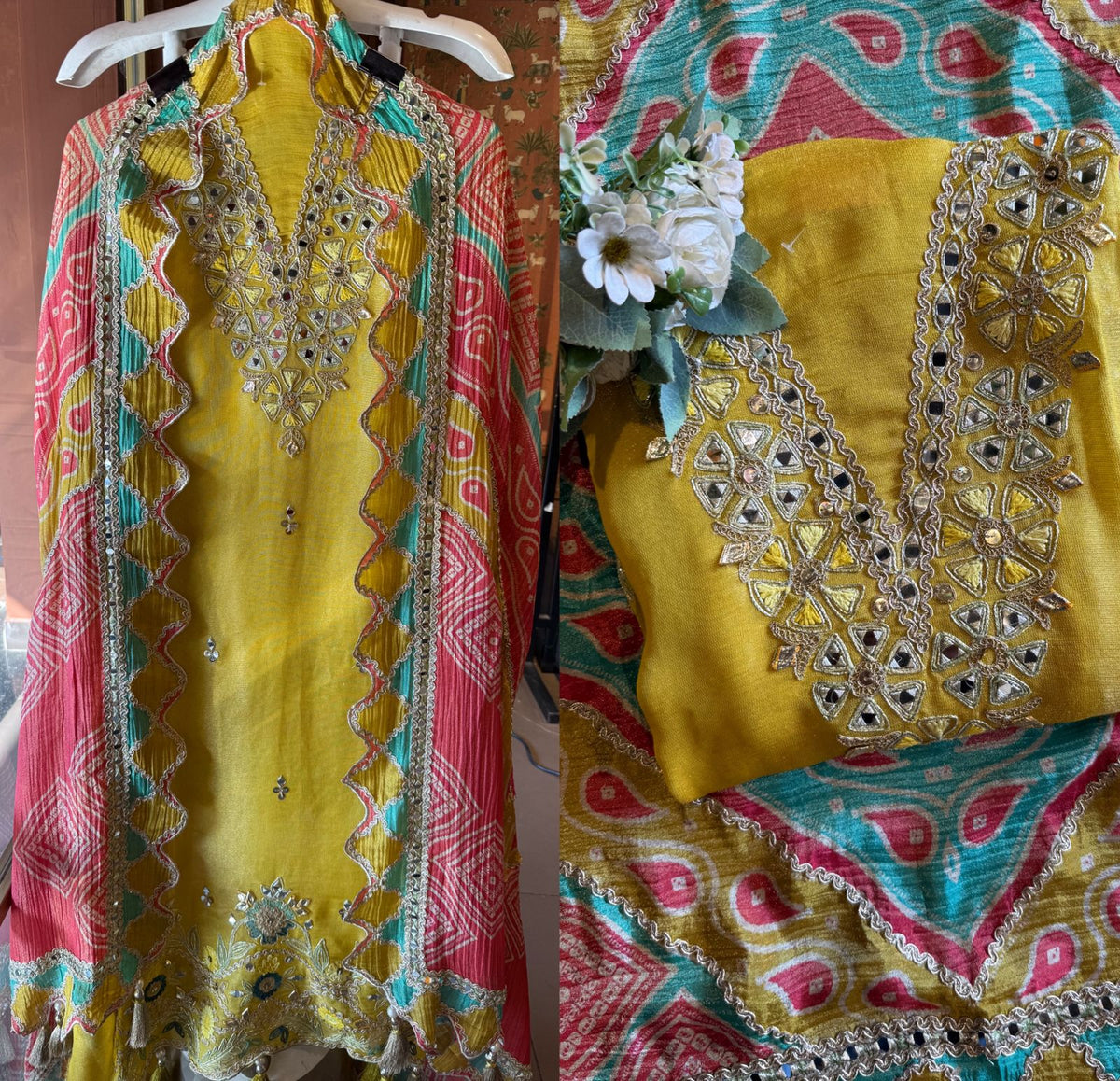 The suit is absolutely beautiful and Graceful , Amazing concept of the dupatta. Looks Vibrant, artisanal, and festive — perfect for mehendi functions, daytime weddings, or cultural celebrations