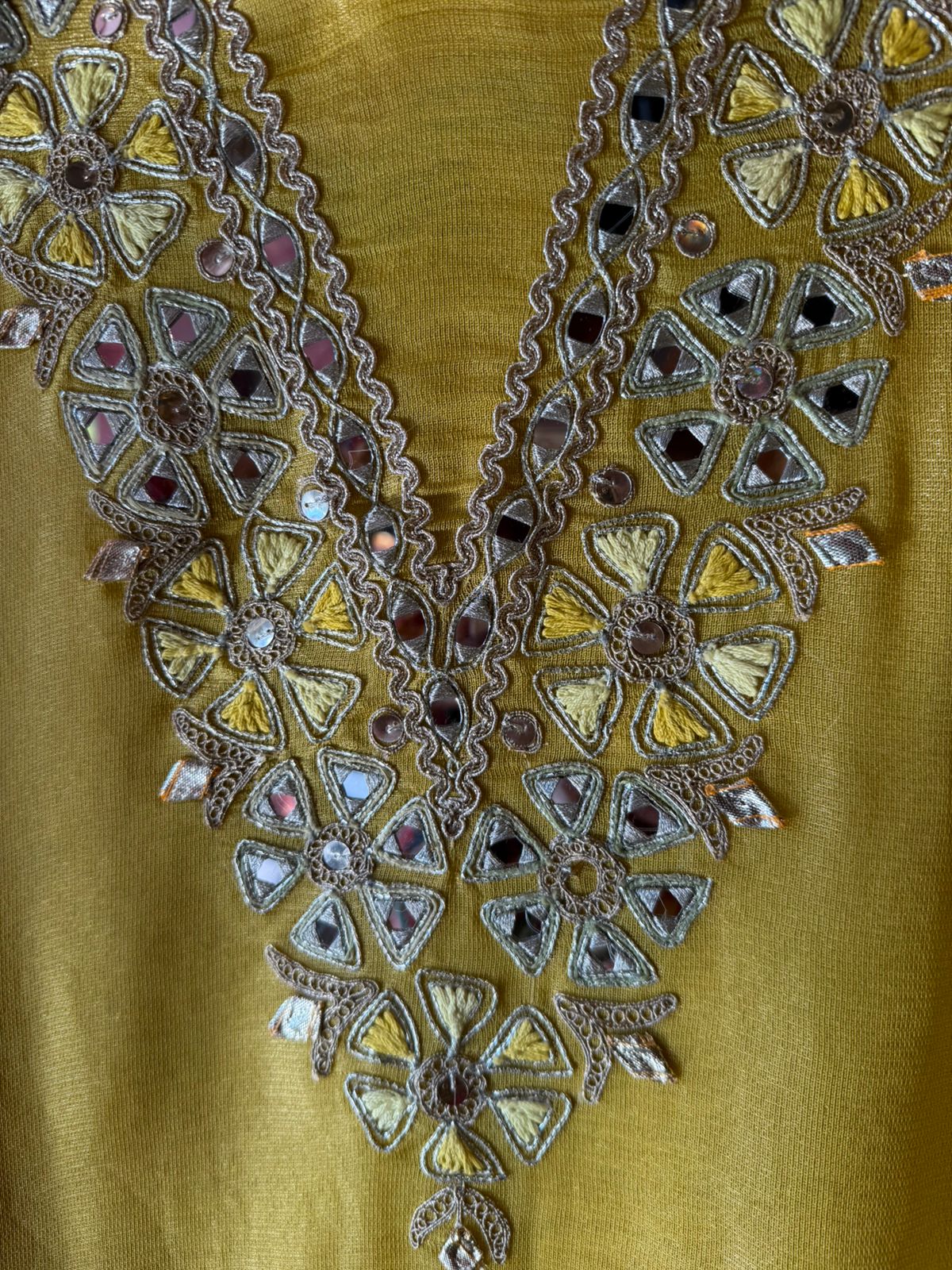 Dense aari & thread embroidery outlining the neckline and front panels