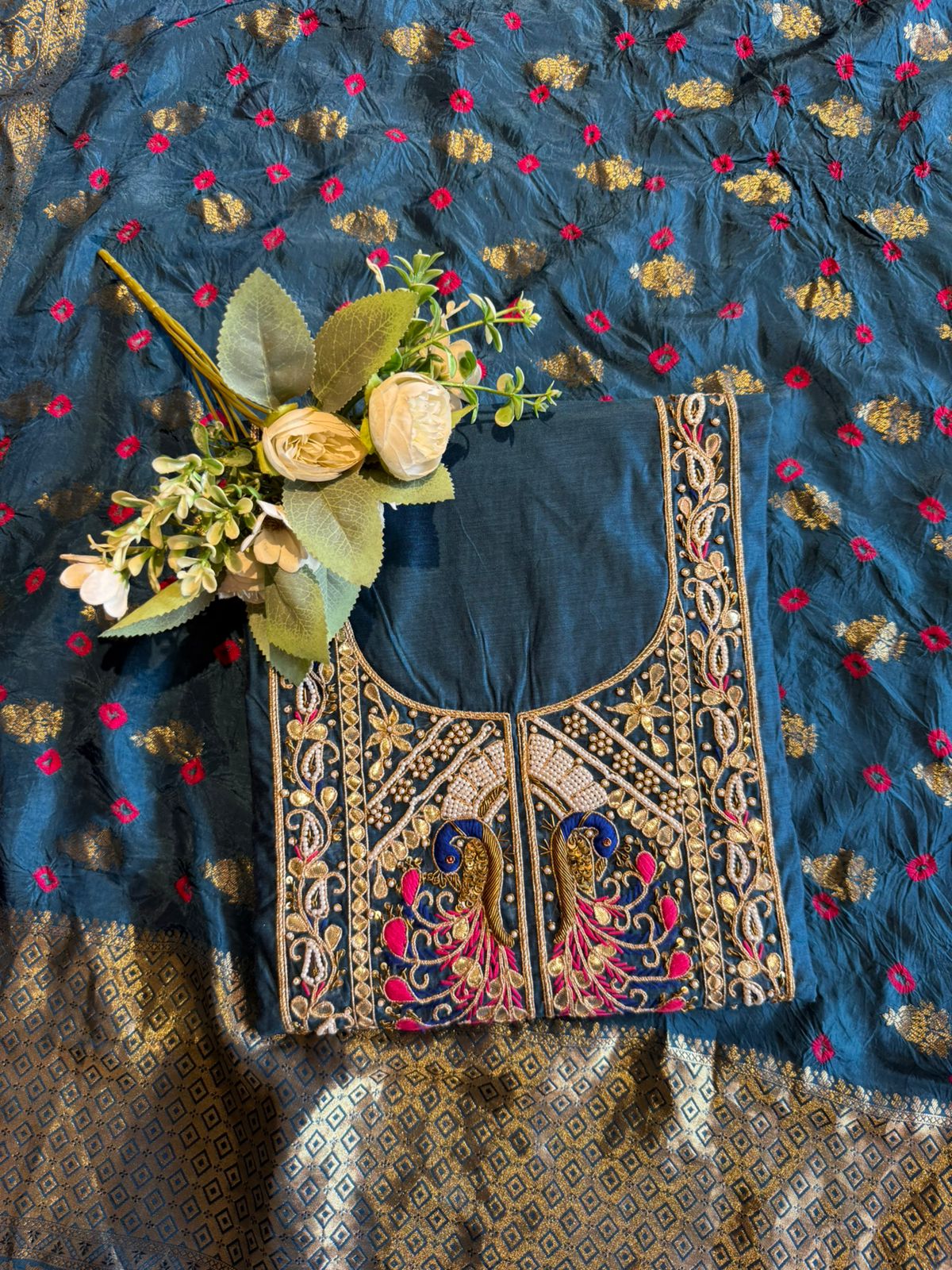 Intricate peacock motif resham thread work in vibrant tones