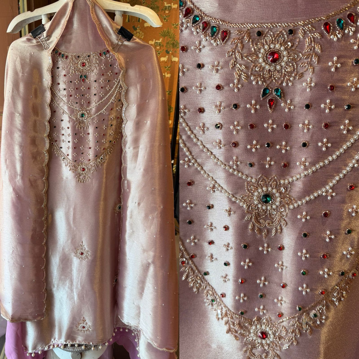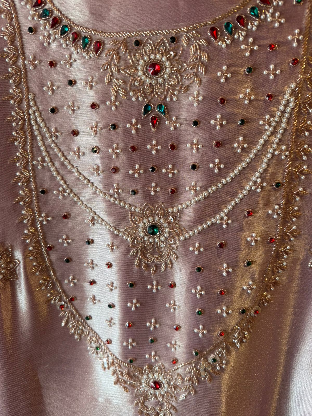 Intricately hand-embroidered neckline panel with Stones, pearl, resham & zari detailing