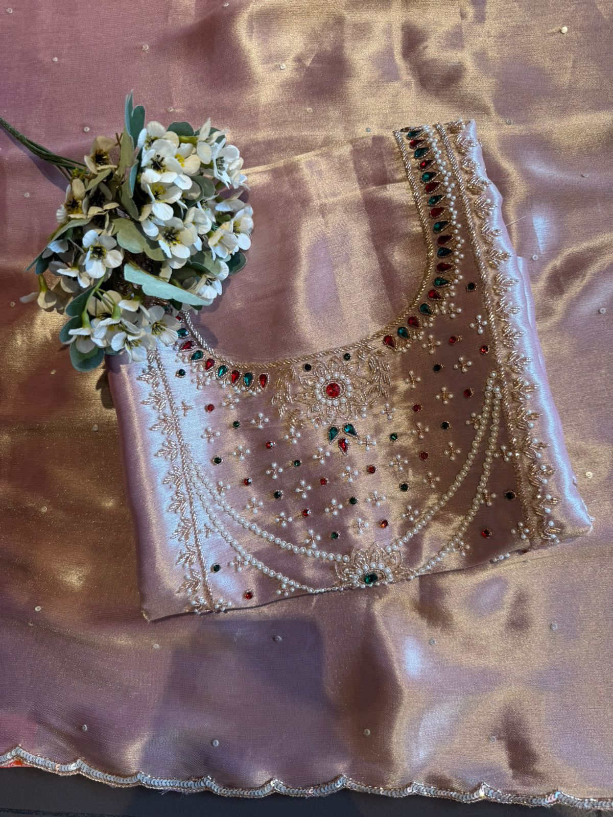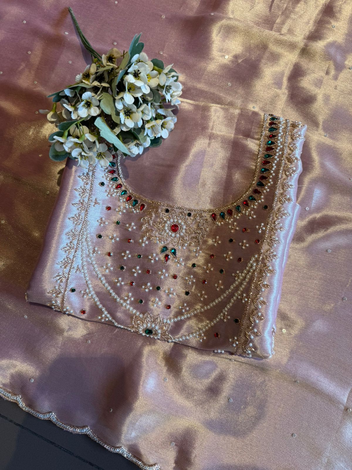 Delicate pearl jaal work scattered across the front for subtle elegance
