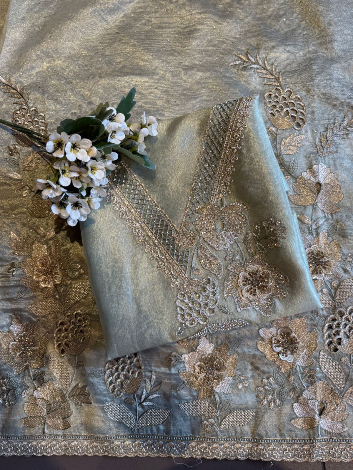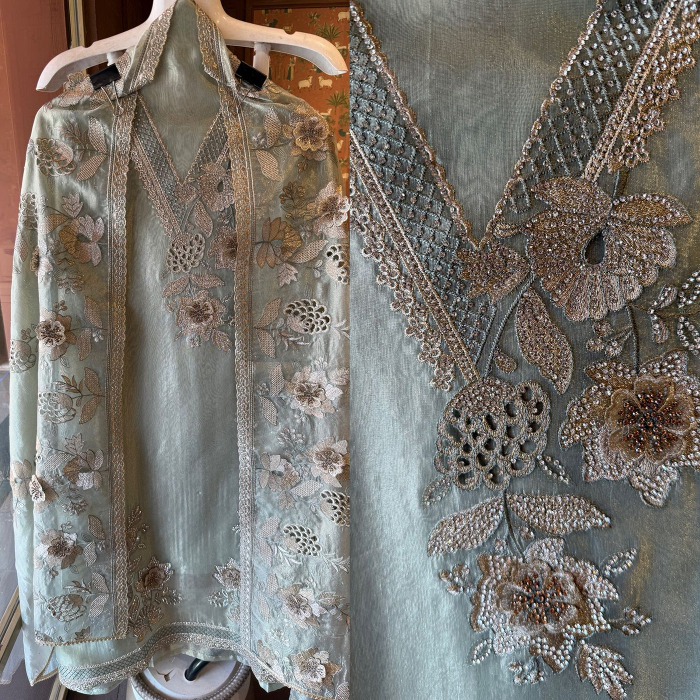 Neckline Design: Deep V-panel style neckline with dense hand embroidery, jaali work & floral motifs highlighted using fine zari and micro-thread detailing.