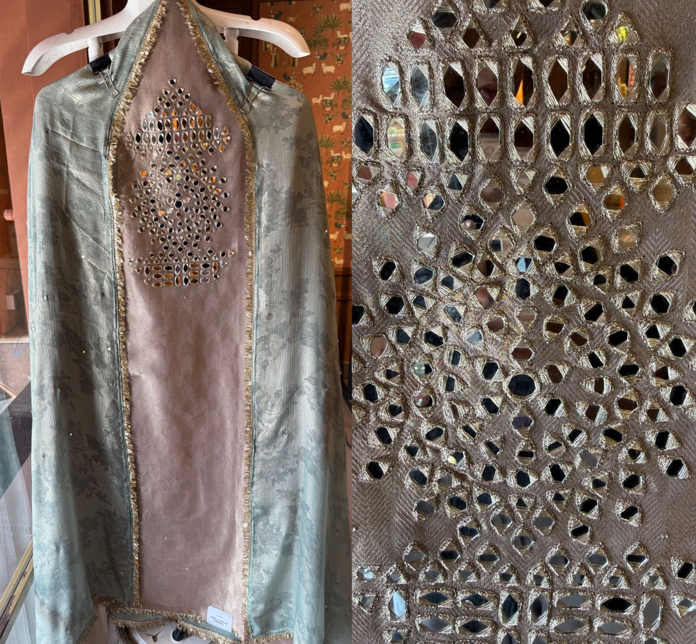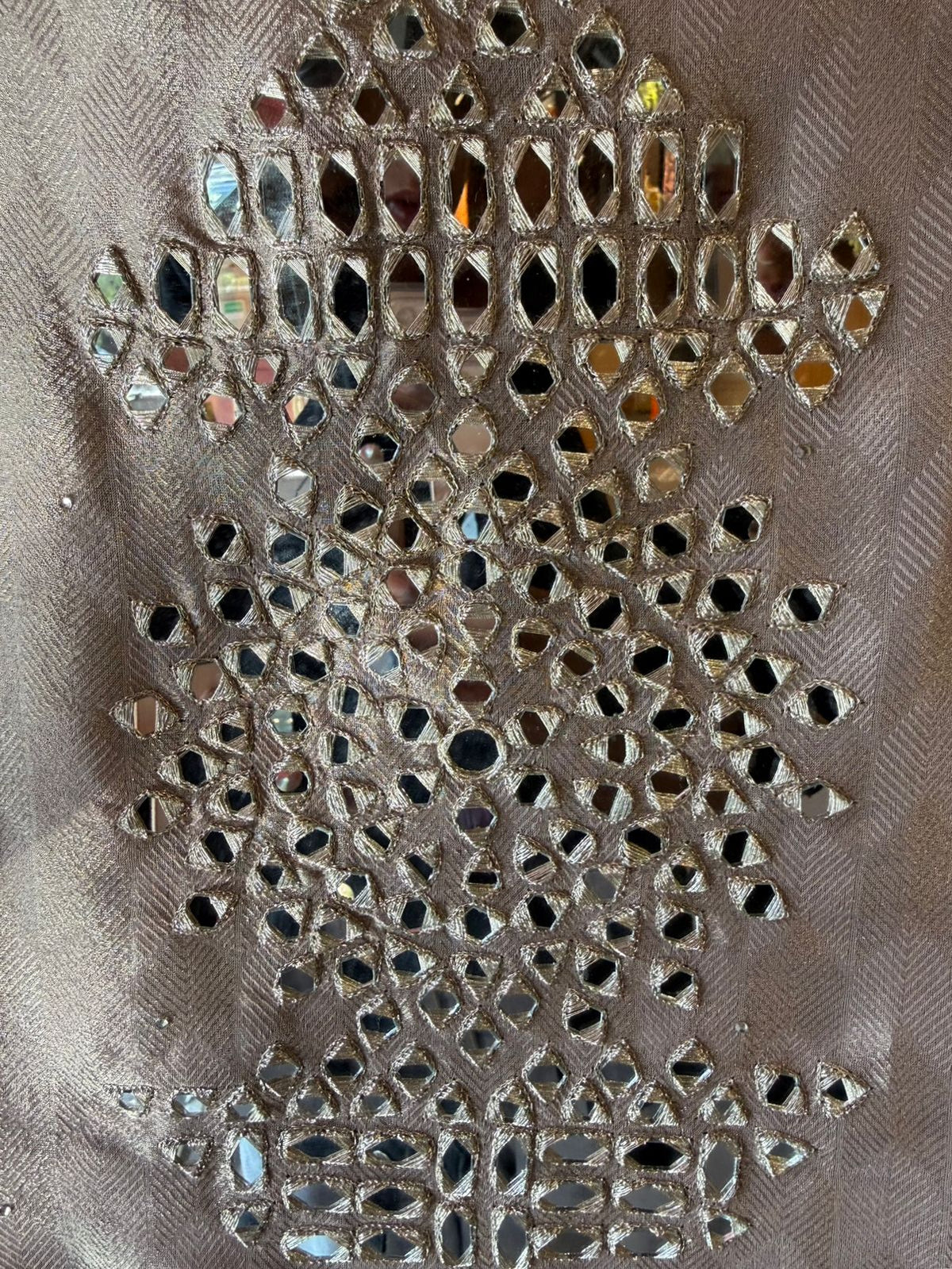 Detailed zari / metallic thread outlining enhancing the mirror pattern for a rich festive glow.