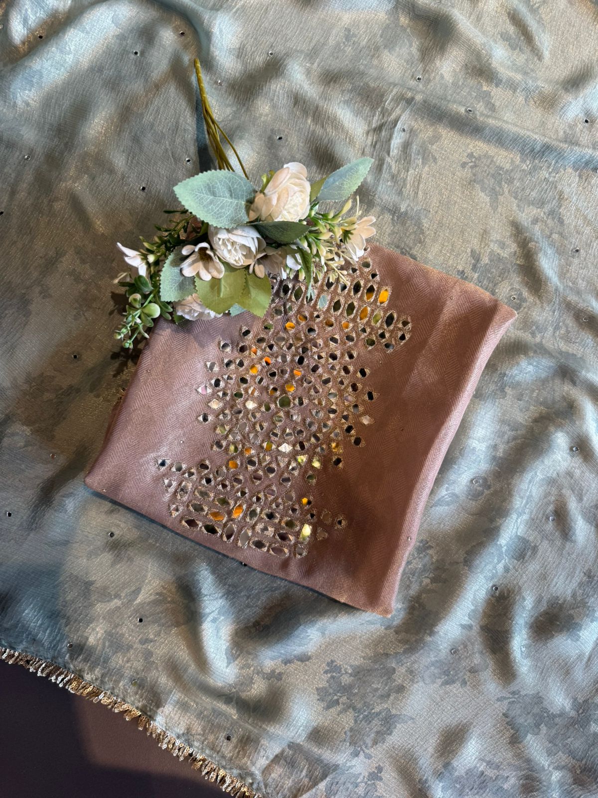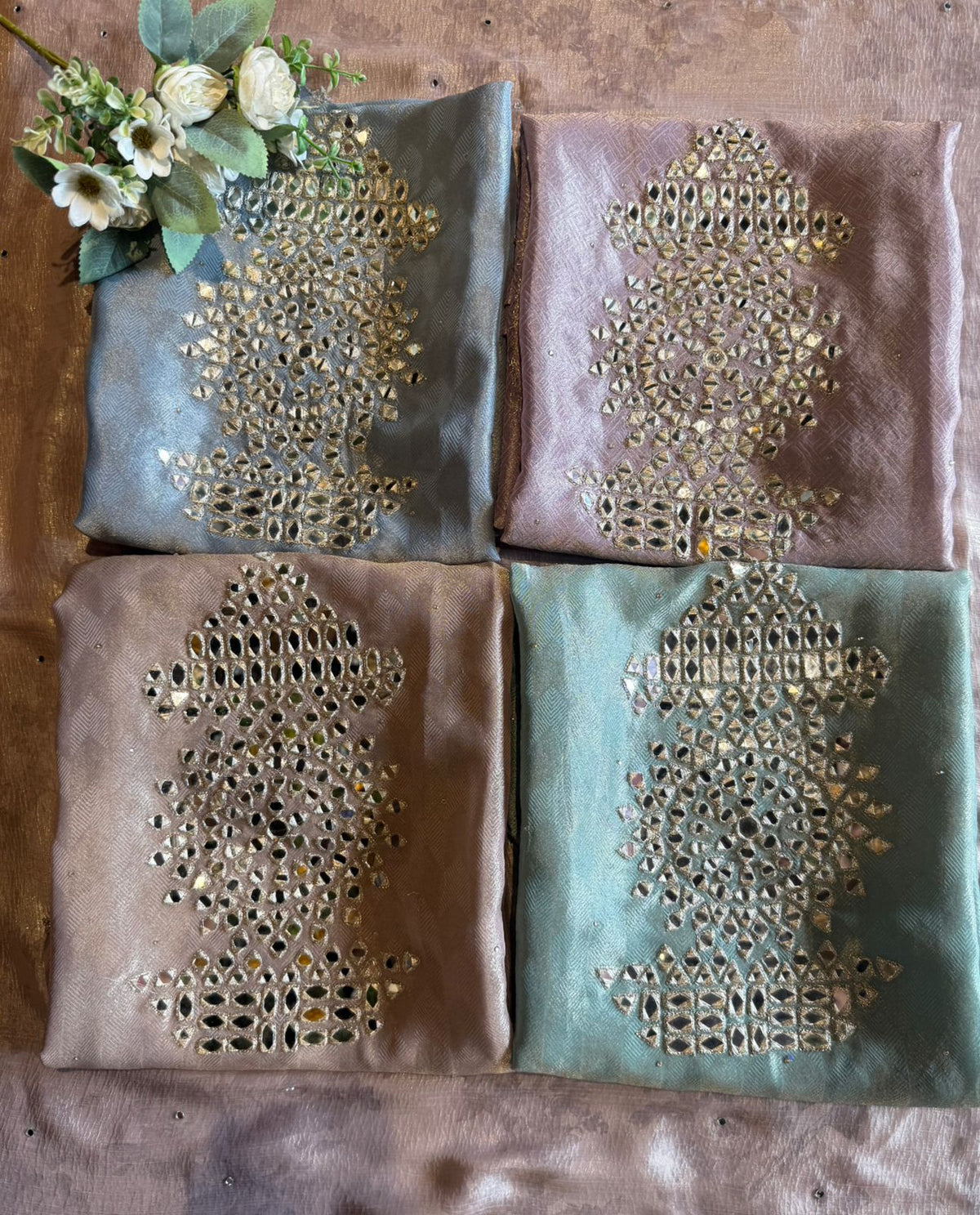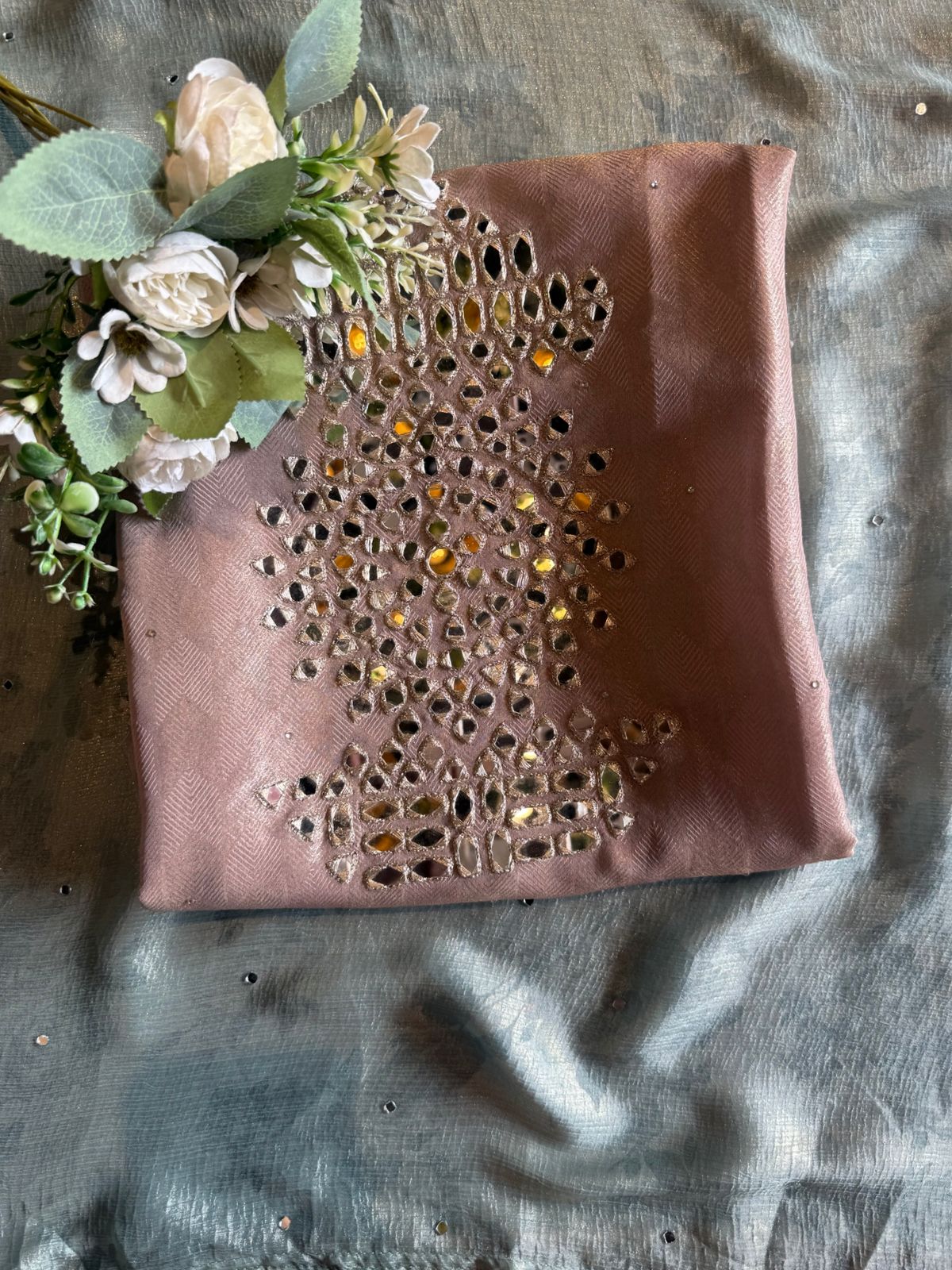 Intricate mirror (sheesha) handwork arranged in a traditional floral motif on the front panel.