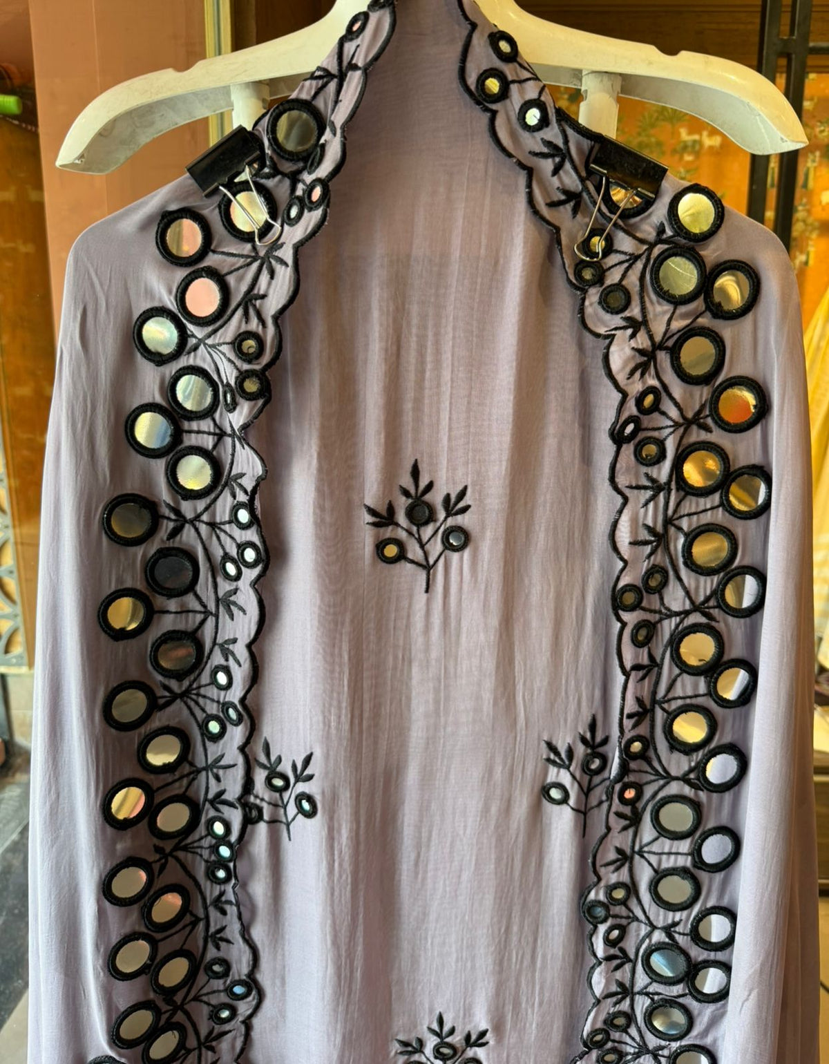 Work: Intricate black thread embroidery with mirror work detailing (False mirror used)