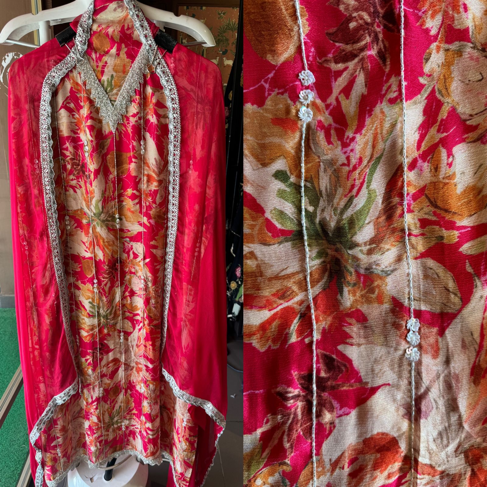 Pure chinon floral digital printed Shirt with nalki work on the shirt front with V neck design