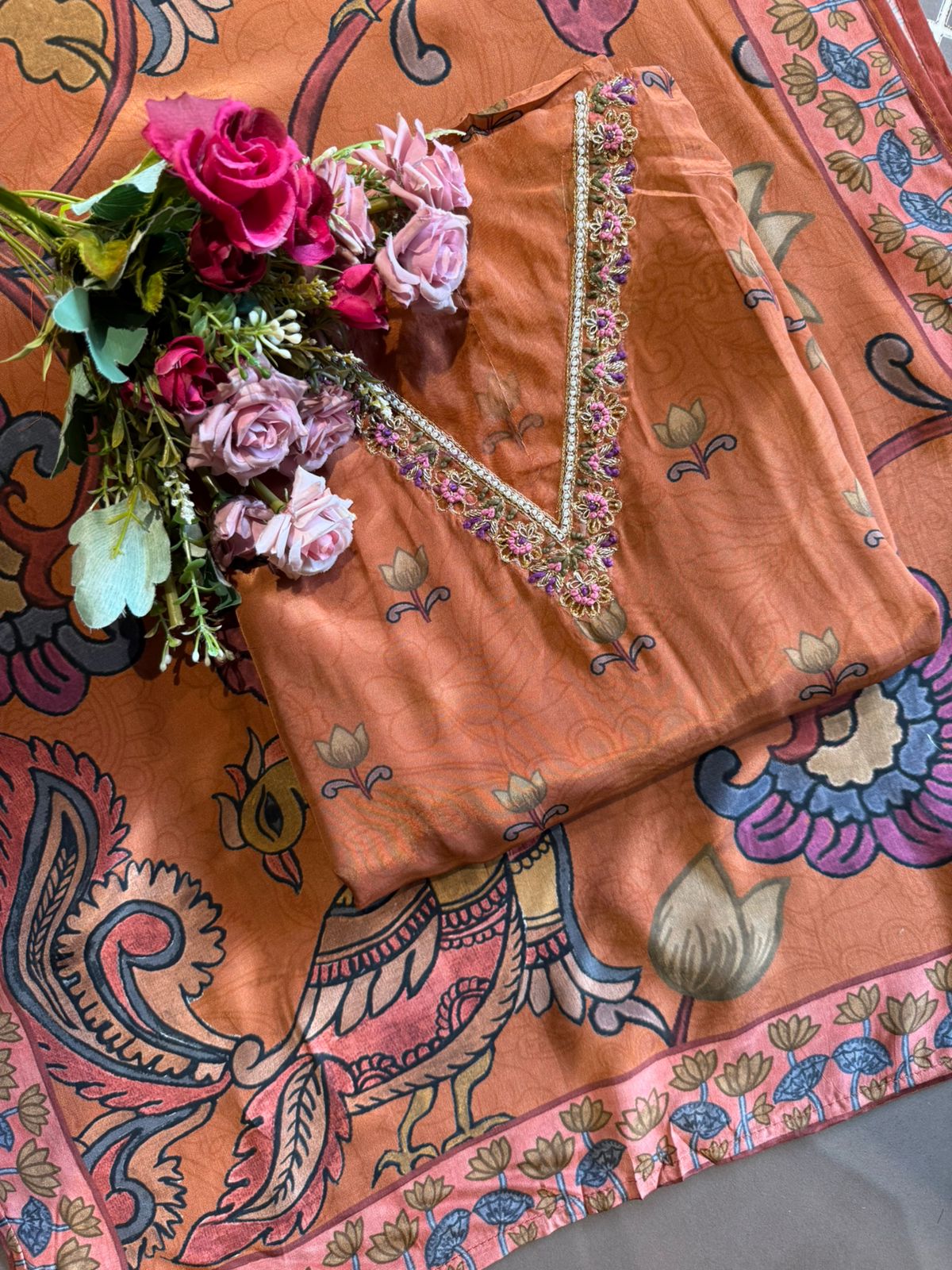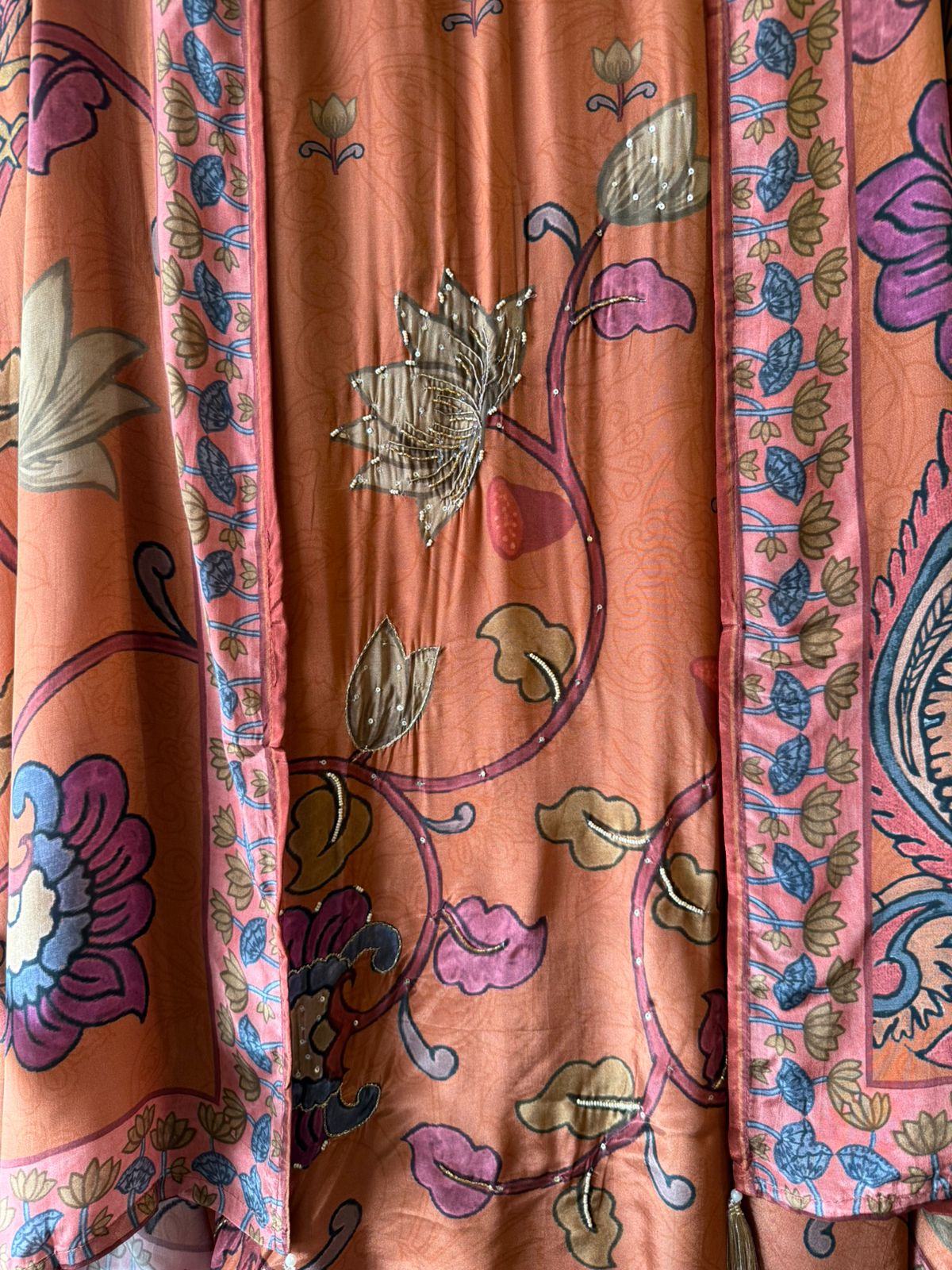 Floral beadwork in pink, lavender, and gold tones. Border is hand-embellished with thread + bead detailing.