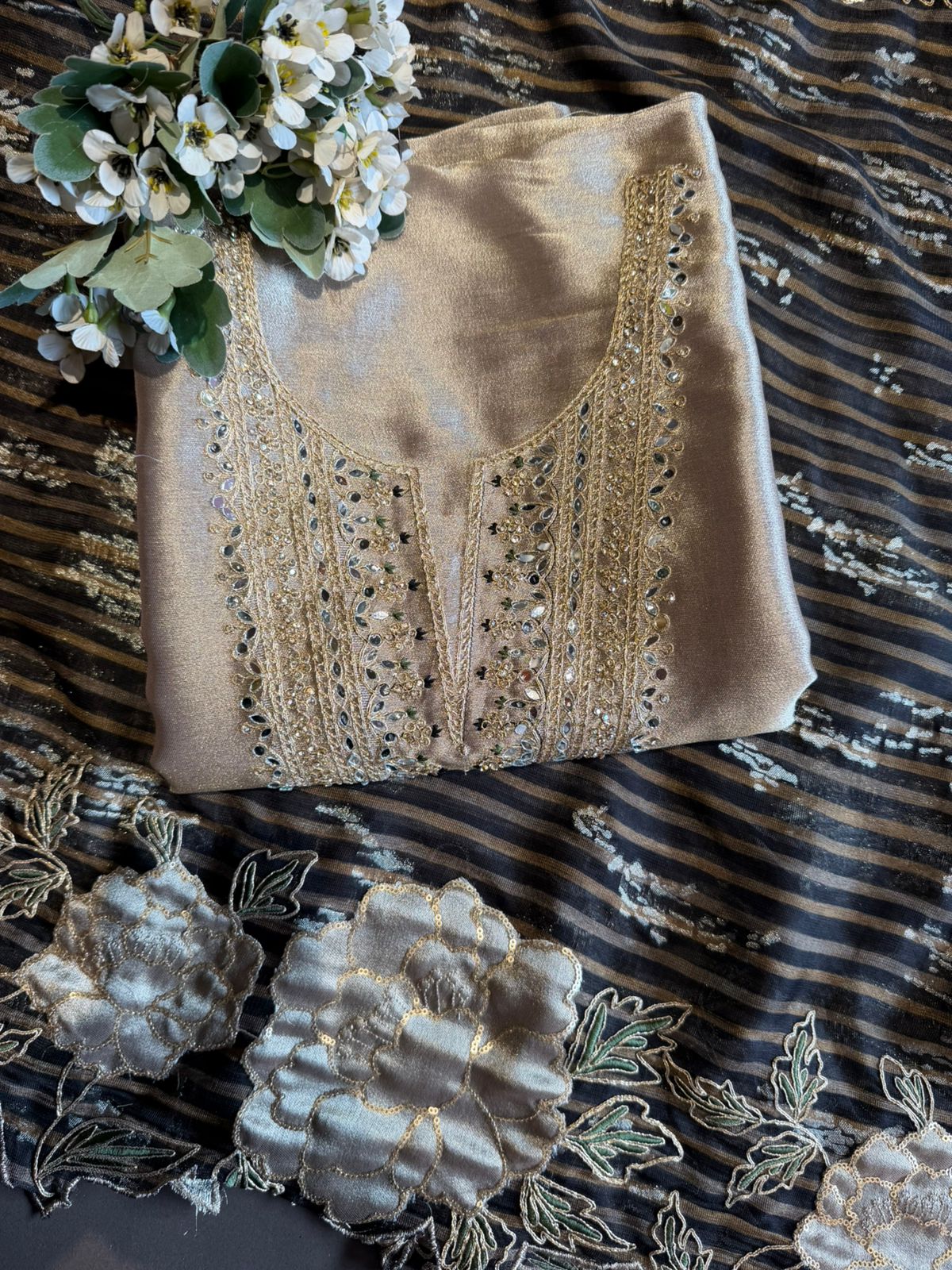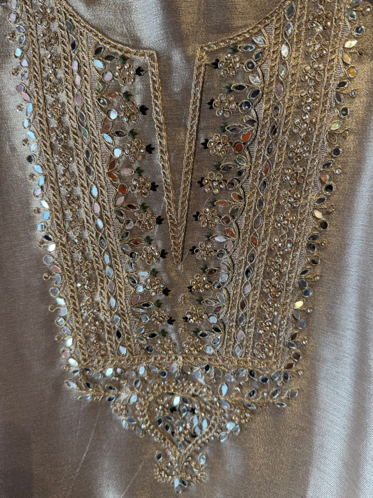 Features a heavily embellished front yoke with mirrors and stones and Zari embroidery.