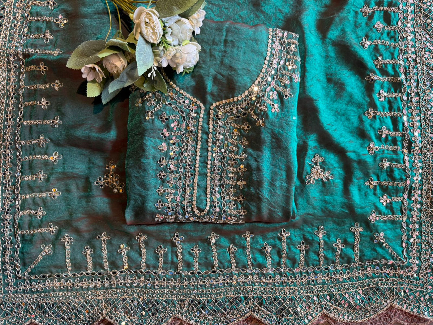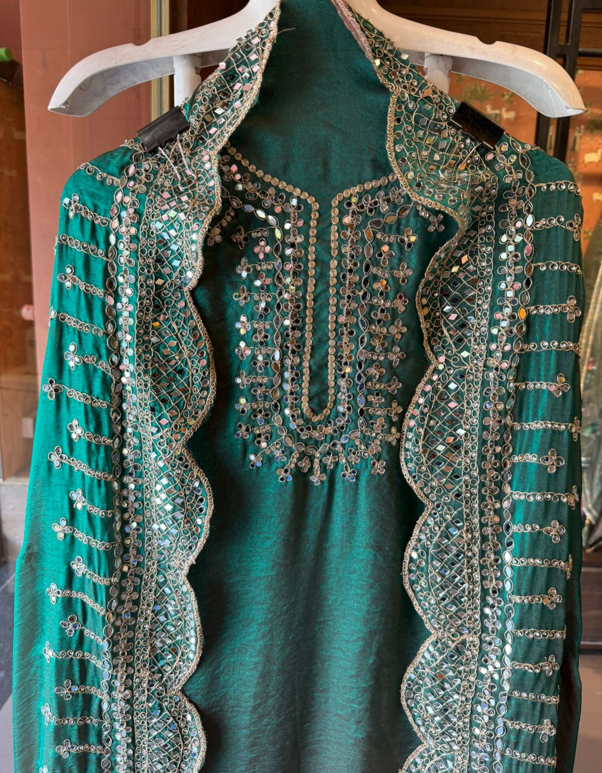 Heavy mirror work (shisha embroidery) dominates the outfit, bordered by fine zari and Dori detailing.