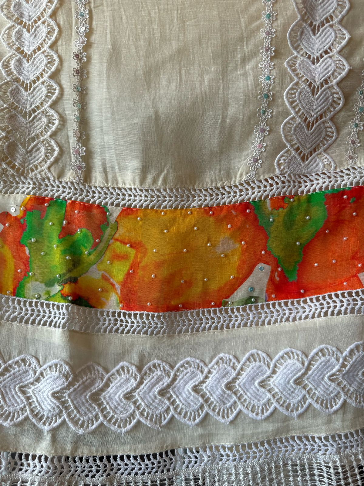 Mul linen Kurta design with printed neck Patti with handwork highlighting.