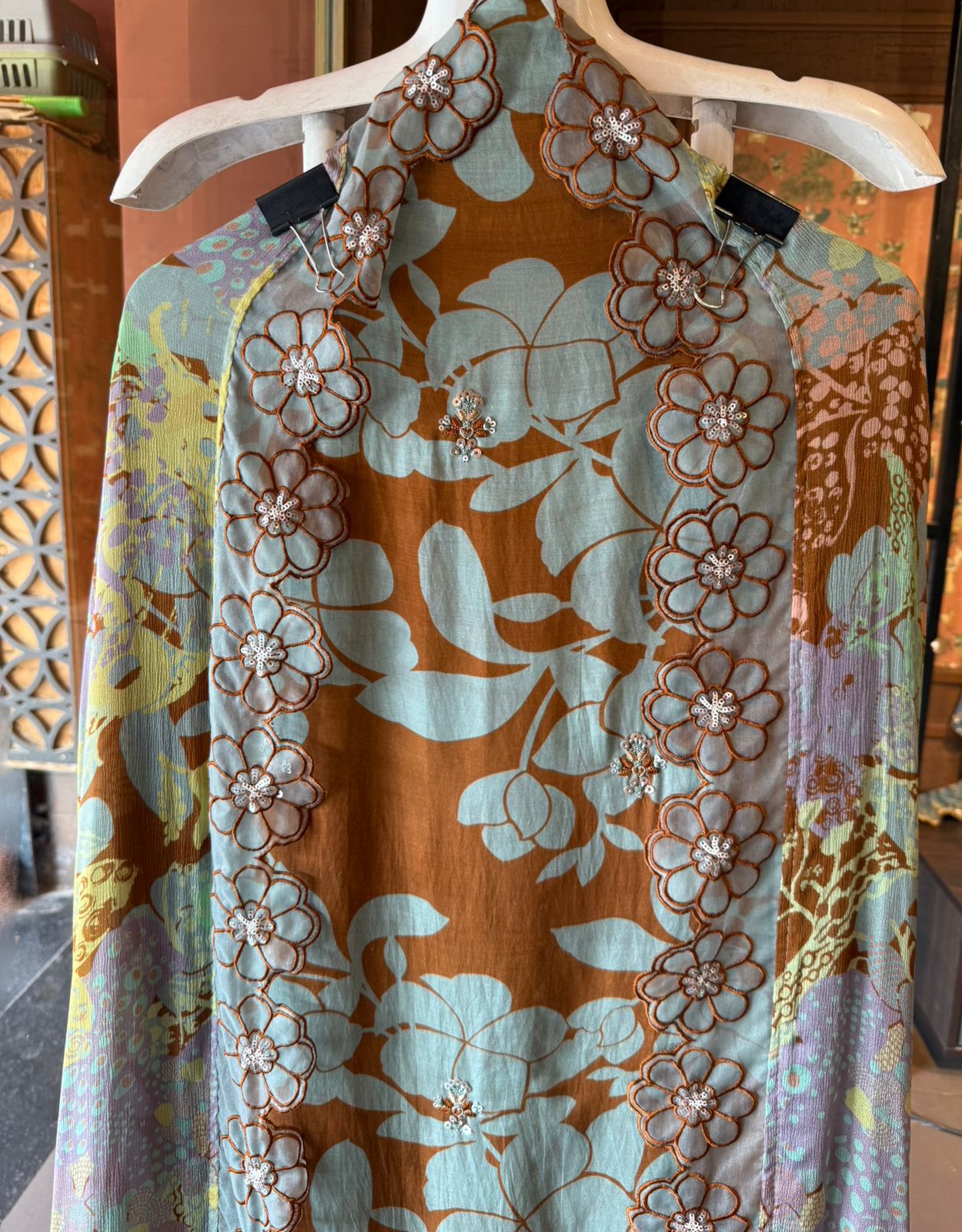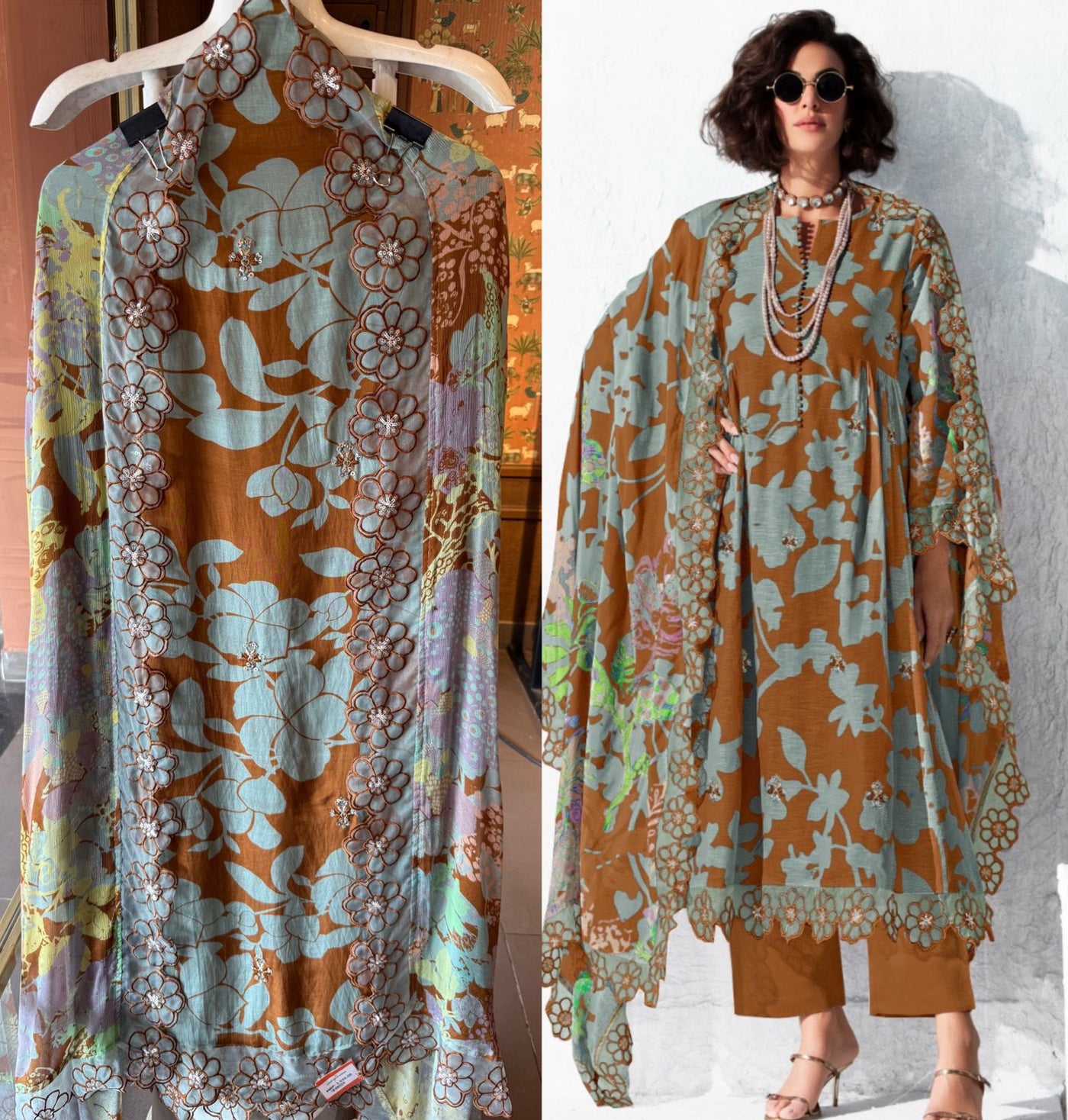 Pure Muslin with digital print embroidery butis on front and scalloped embroidered floral border for the hemline and sleeves