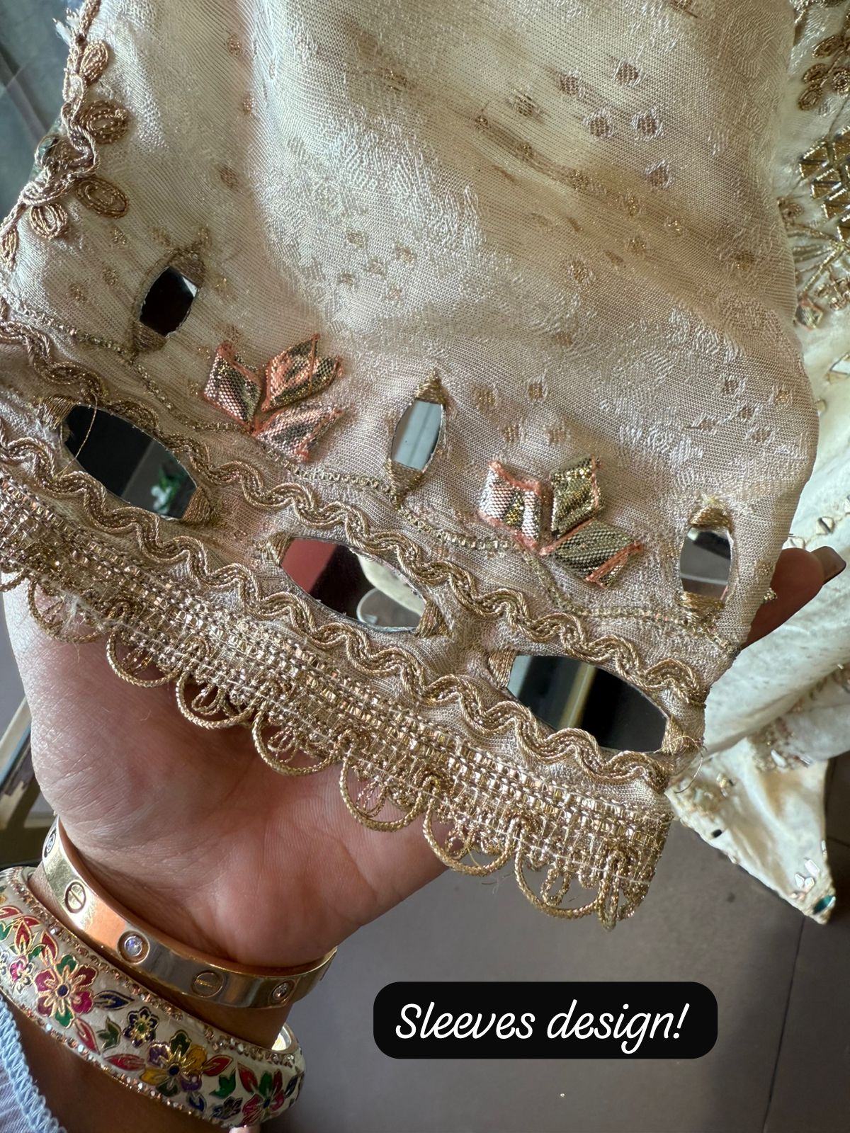 Floral motifs on the hem and sleeves with zari and mirror embellishments.