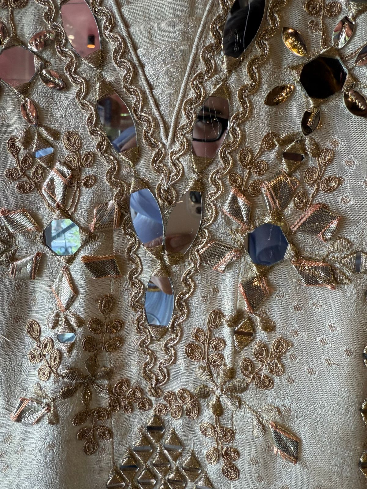 Heavy mirror work and gotta patti embroidery around the neckline and down the front