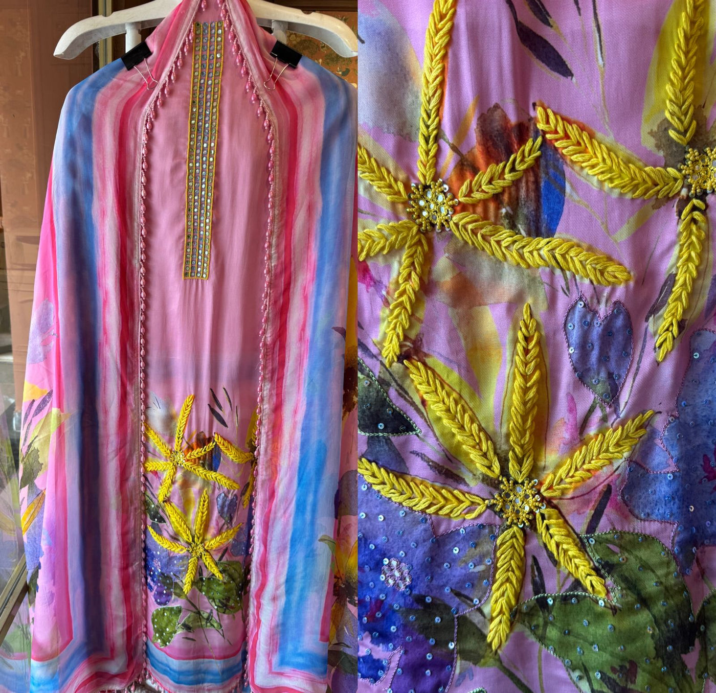 Printing done on the full shirt with beautiful neck patti embellished with mirror and motiwork.
