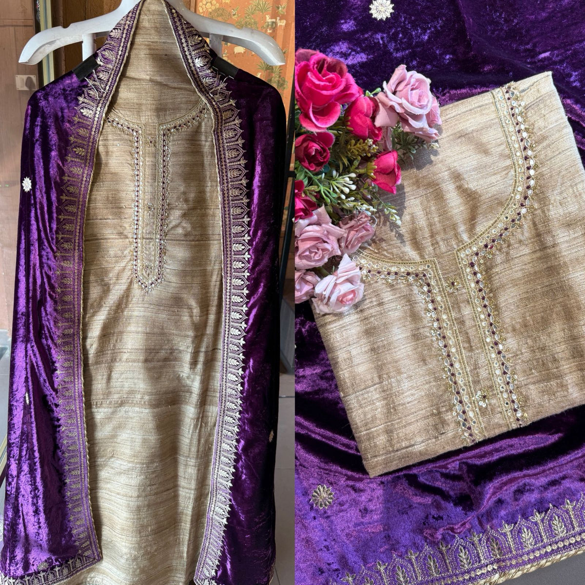 Pure velvet shawl with Zari embroidered four sides border with small booties scattered all over.