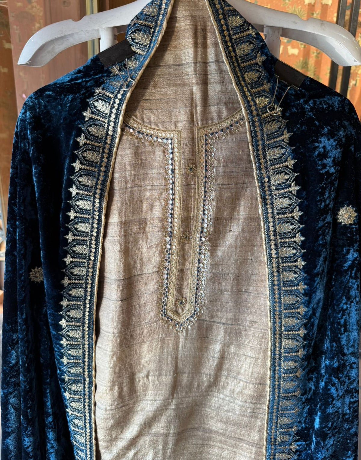 U-shaped neckline with dabka and thread detailing.