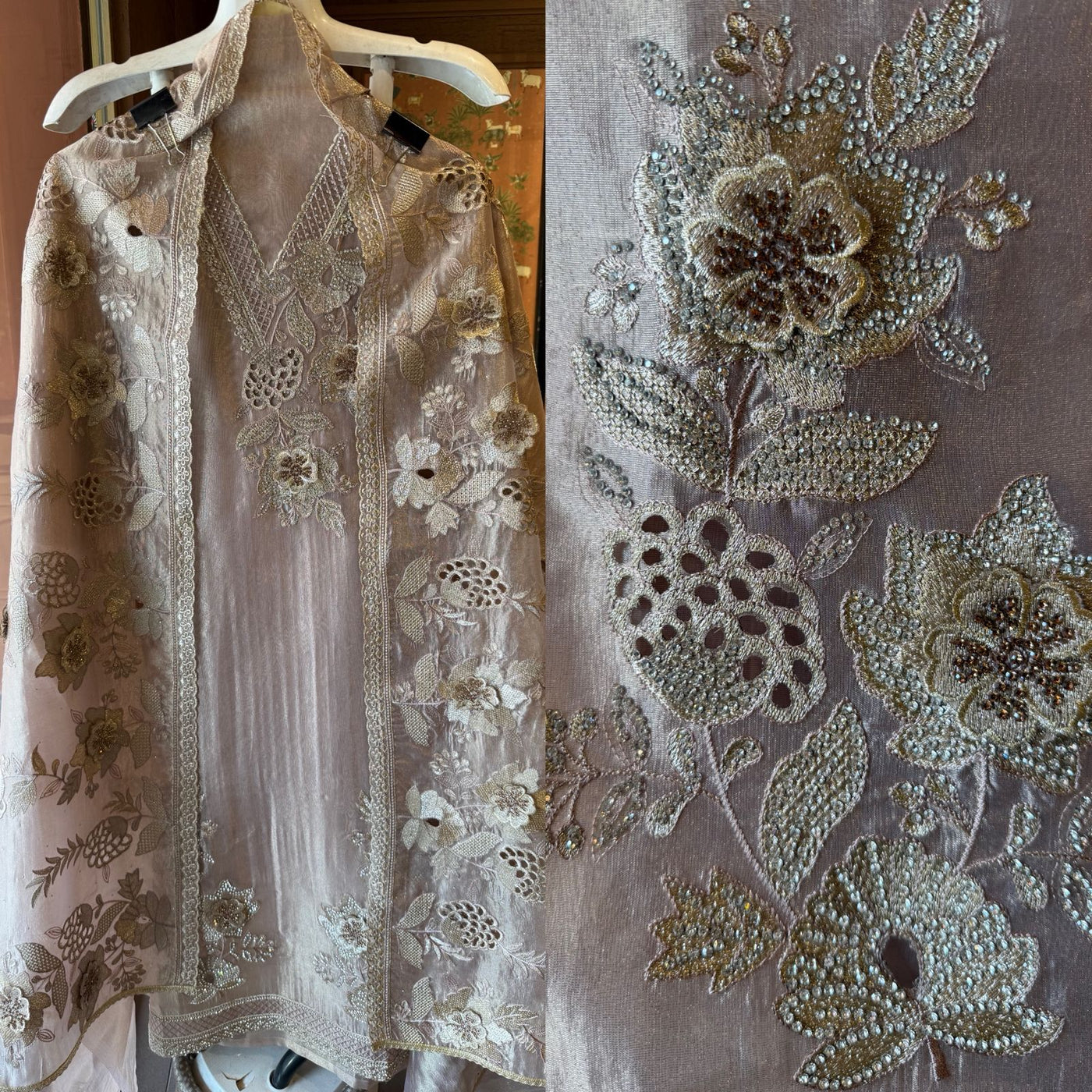 Embroidery: Intricate all-over floral thread embroidery crafted in zari & resham, creating a delicate raised texture.