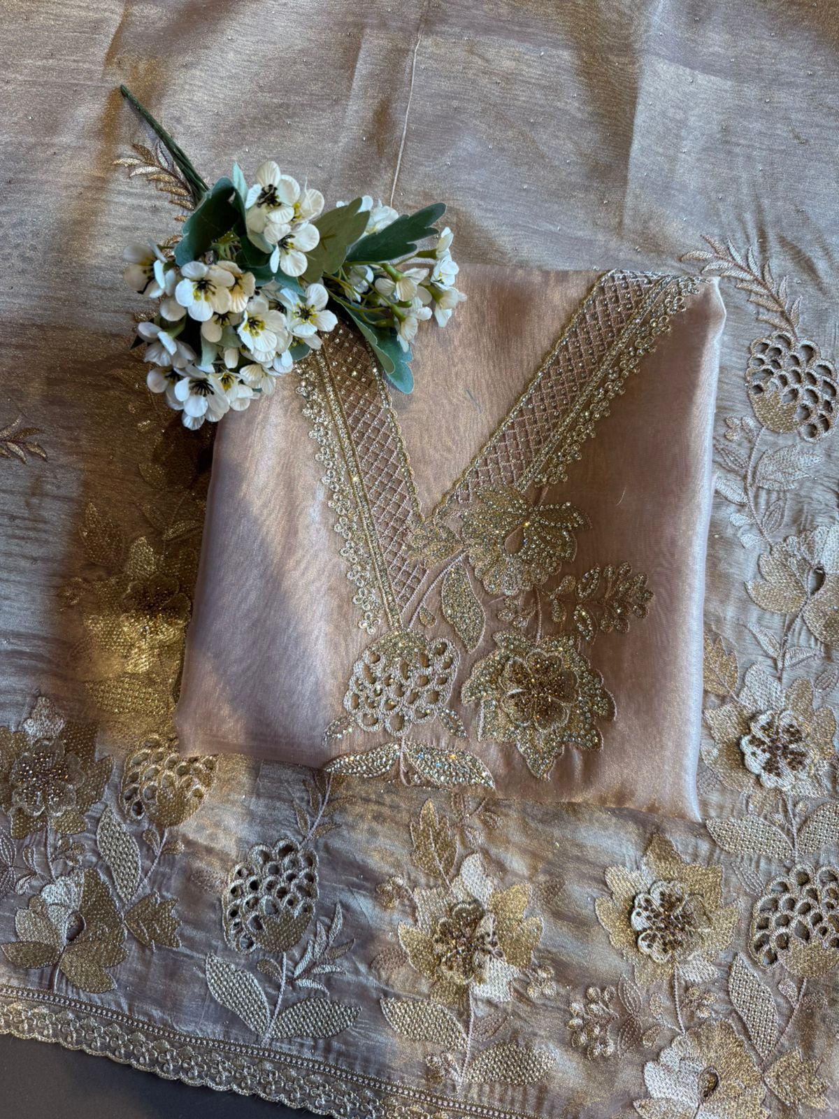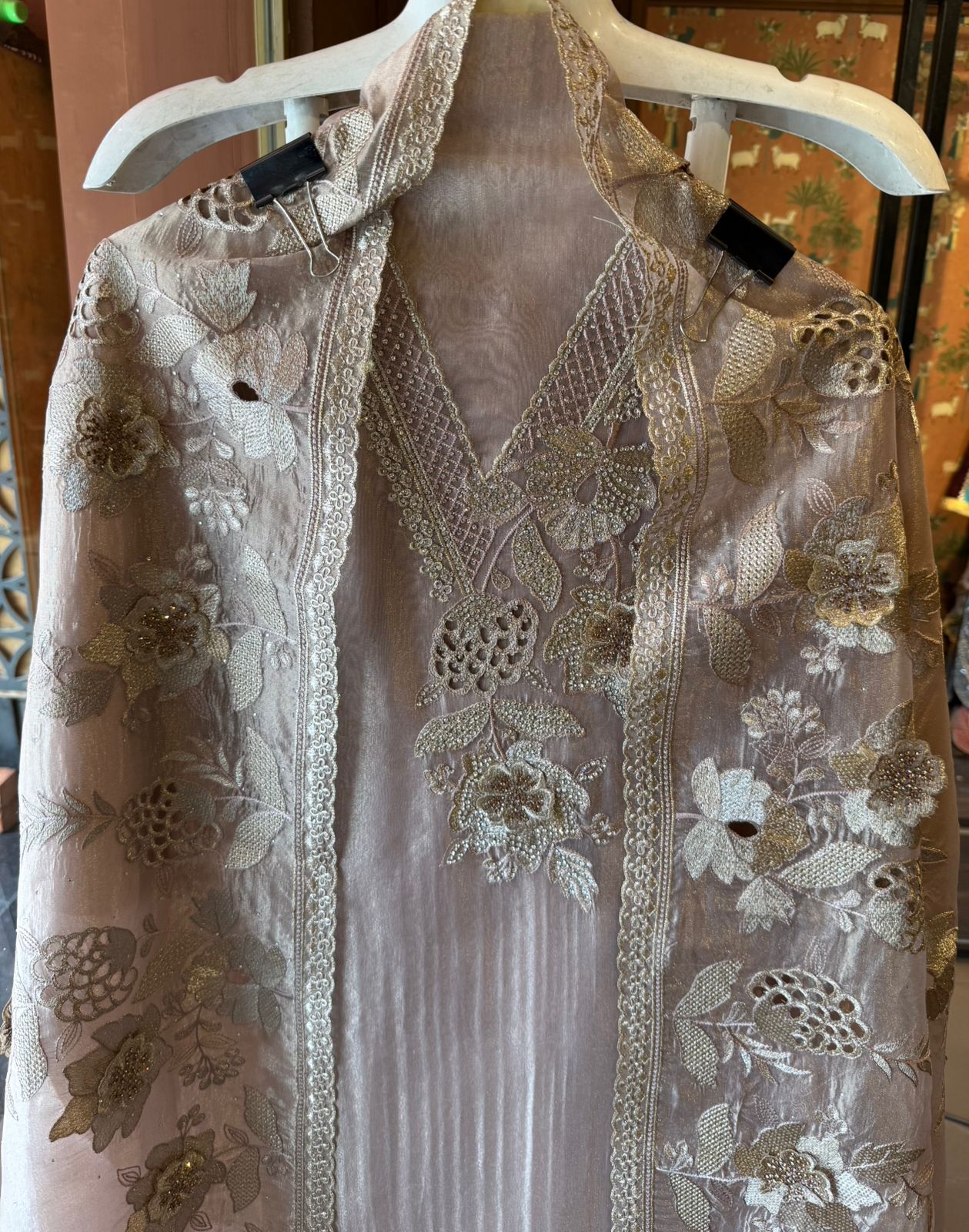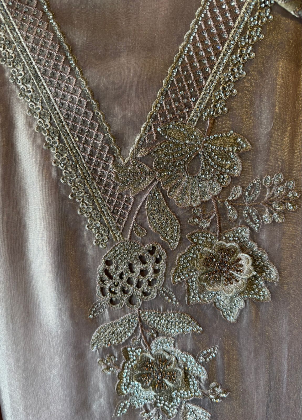 Neckline Design: Deep V-panel style neckline with dense hand embroidery, jaali work & floral motifs highlighted using fine zari and micro-thread detailing.