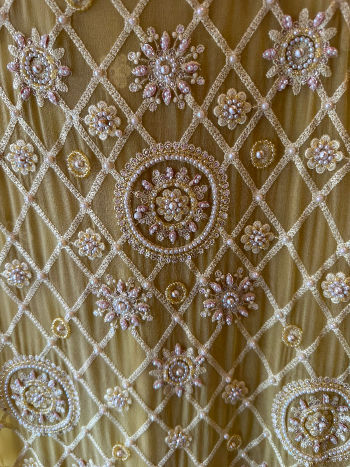 The entire front features an intricate geometric jaal (lattice) pattern created with fine thread embroidery. Each intersection is highlighted with delicate pearl, bead and sequin handwork. Large circular and floral motifs are l handcrafted, giving the outfit a regal and luxurious feel.