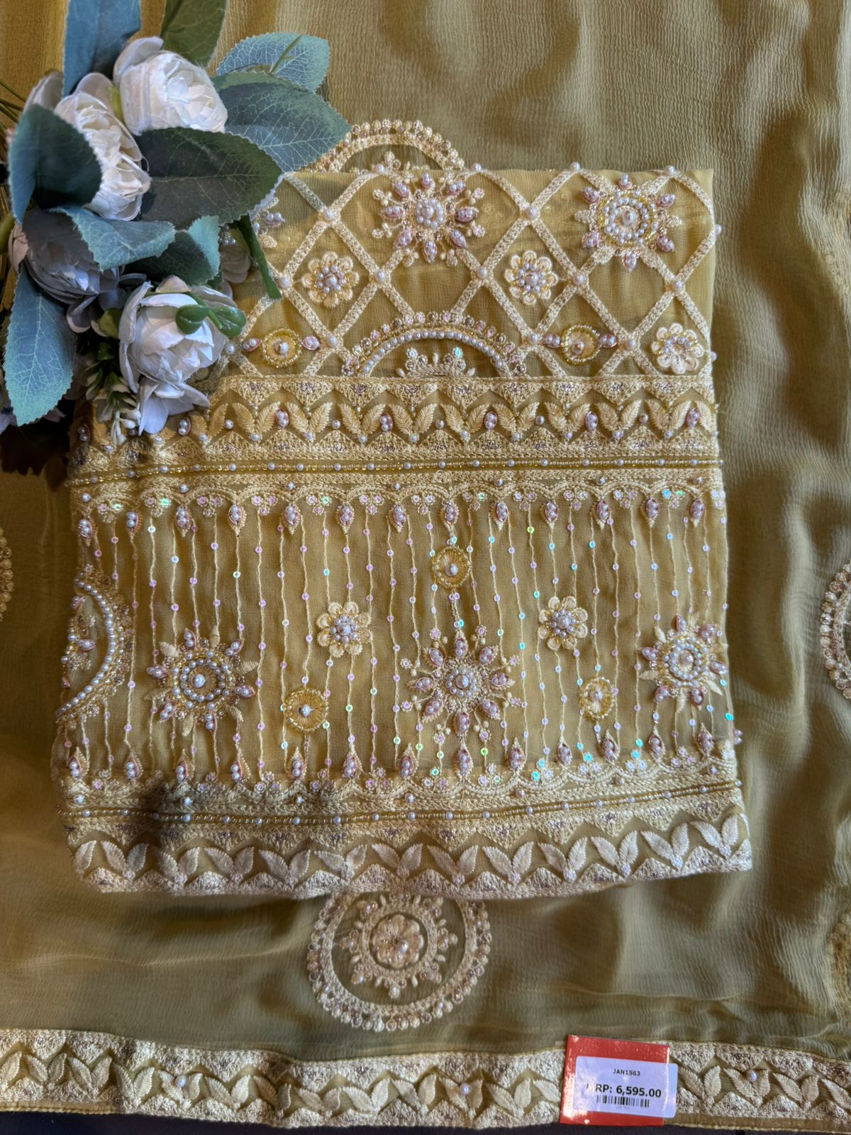 Premium Georgette base in a rich colour , giving a soft fall with a subtle sheen.
