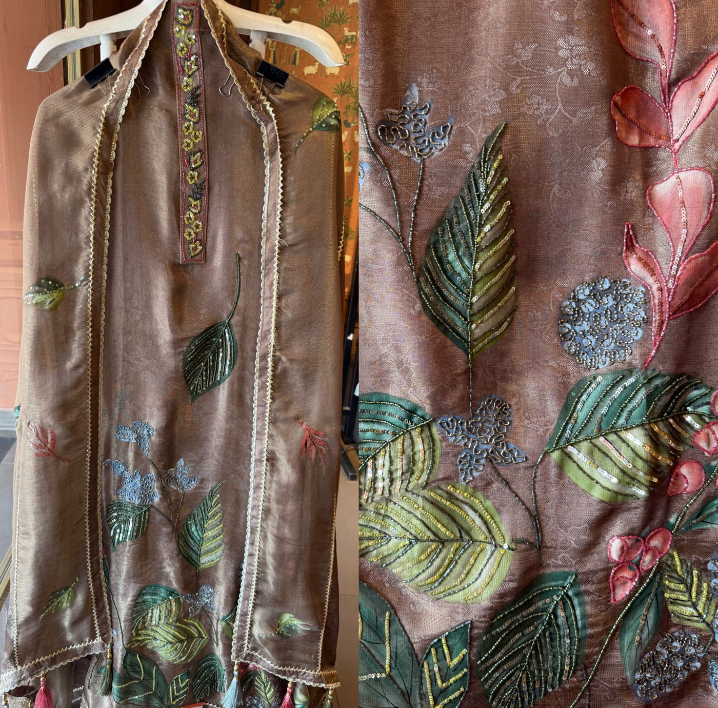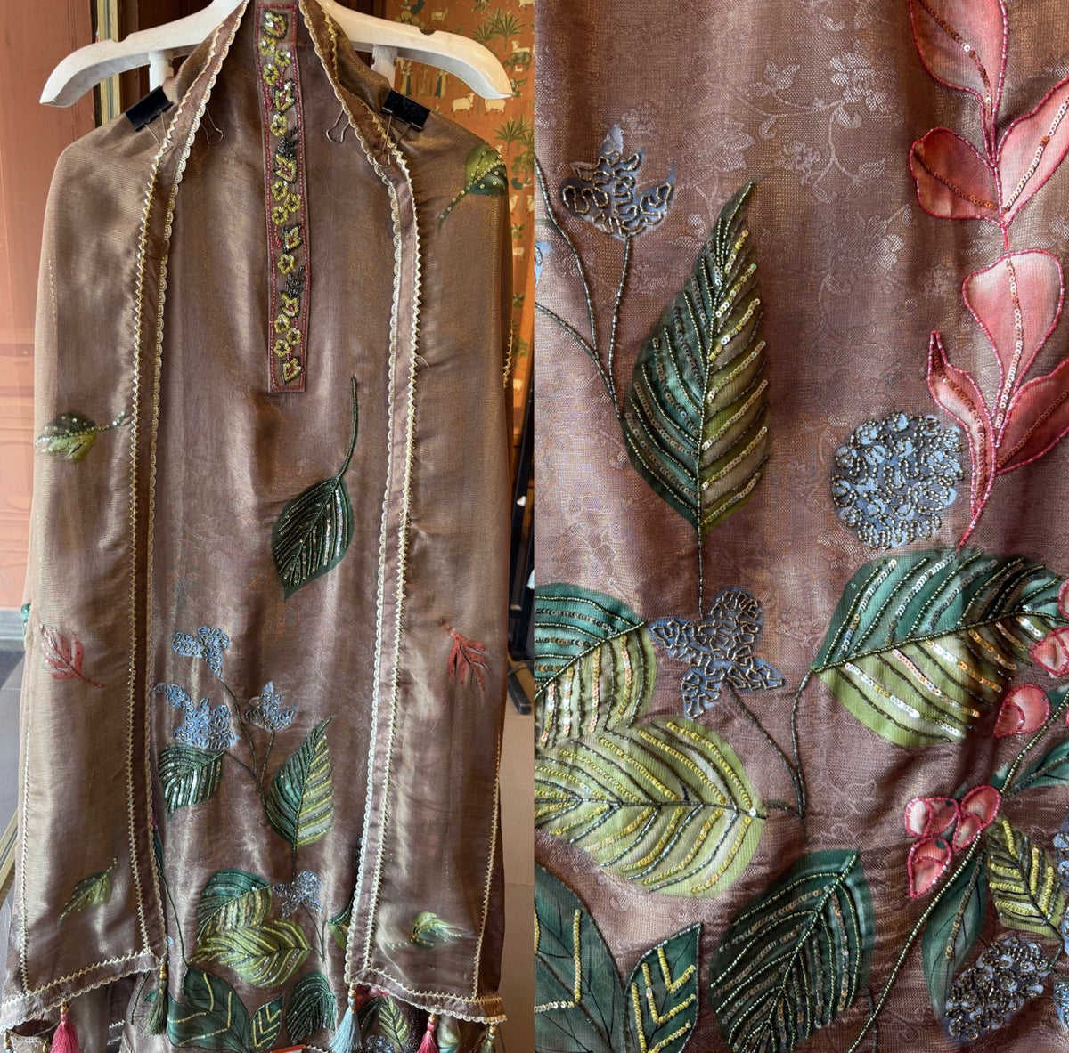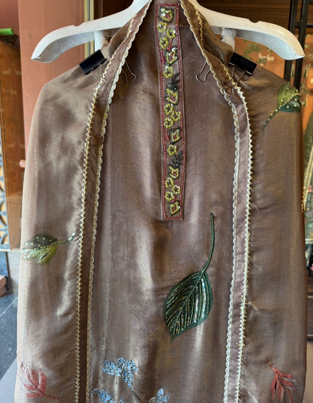 Neckline: Elegant detailed placket with handcrafted embroidery highlights (Beads and Nalki’s)