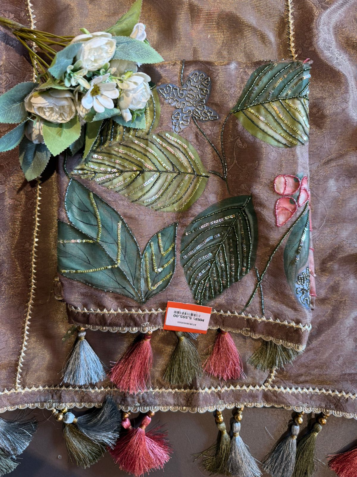 Dupatta: Matching embroidered dupatta On Tissue jacquard with scalloped edges & tassel finish.