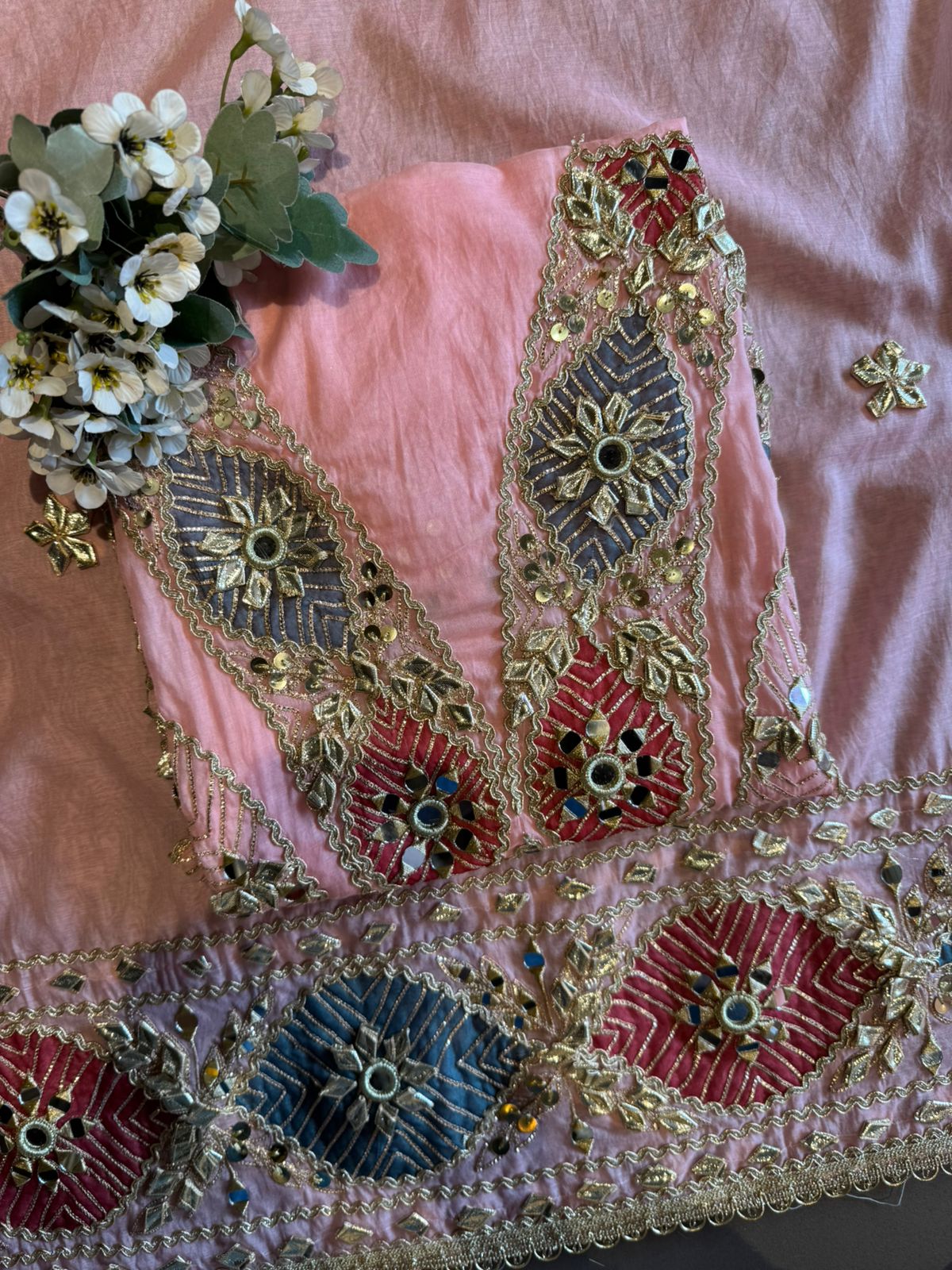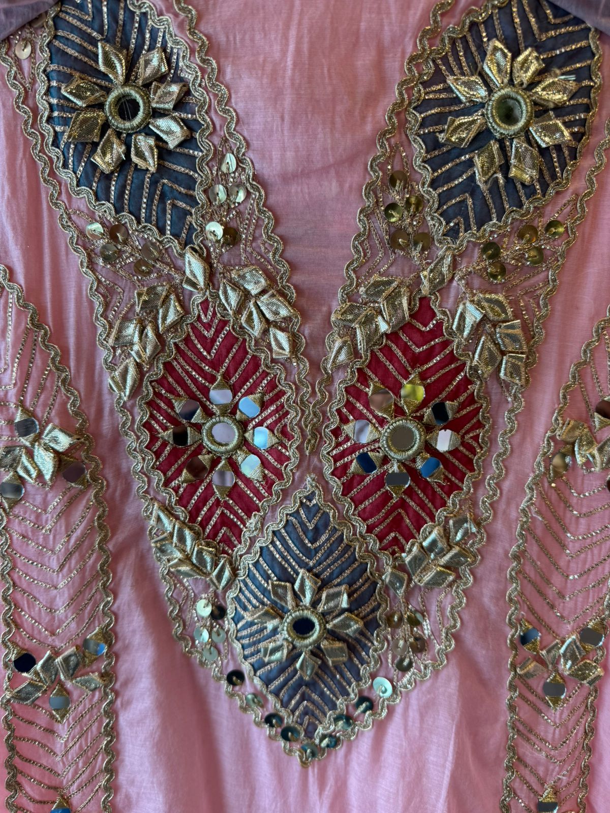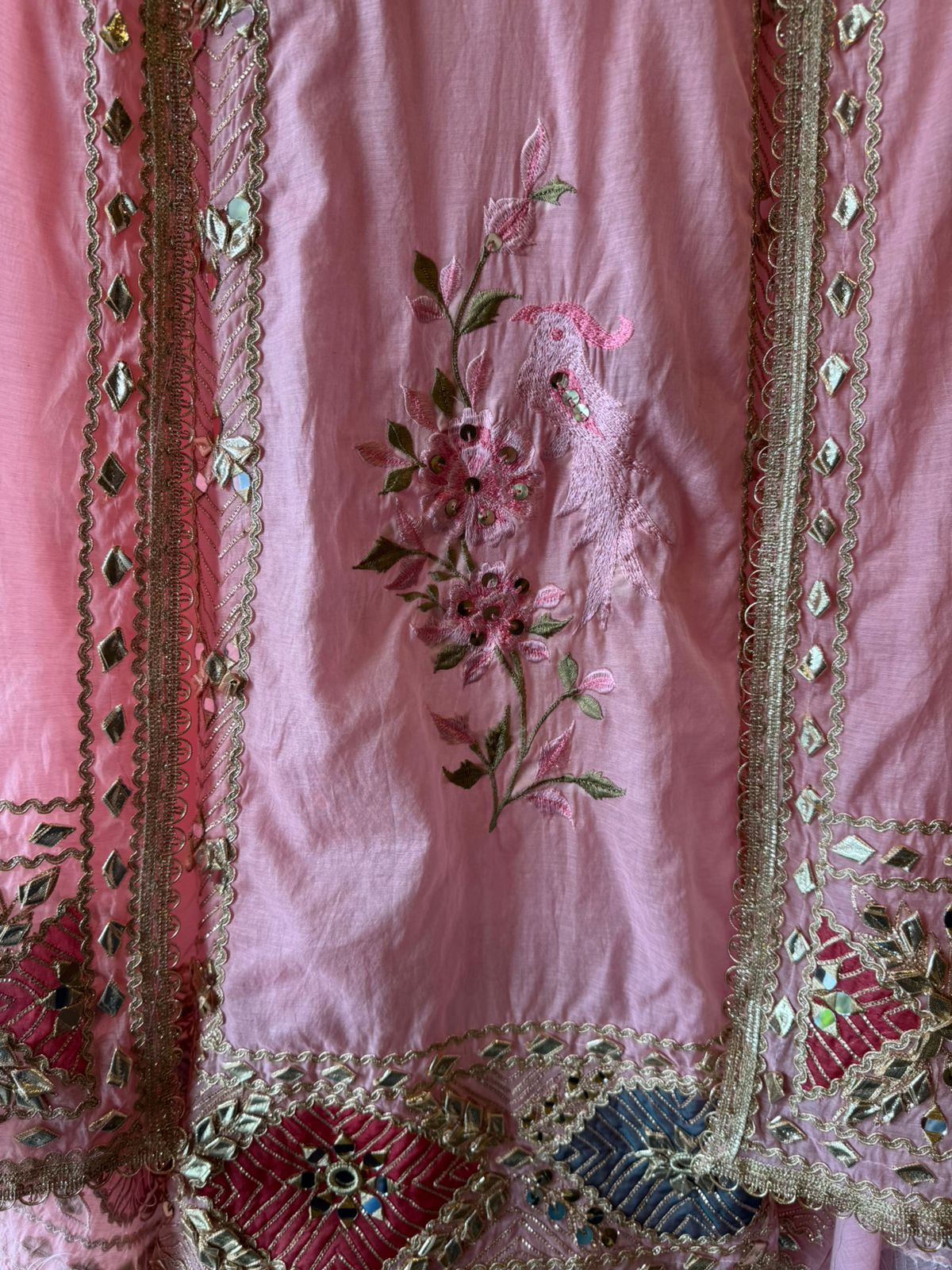 Embedded mirror (shisha) work at motif centers. Outlined with scalloped zari borders.