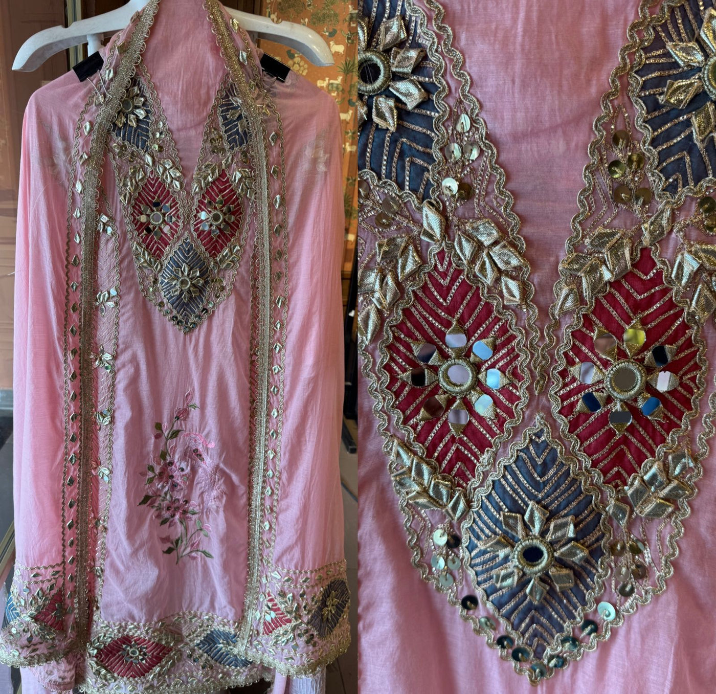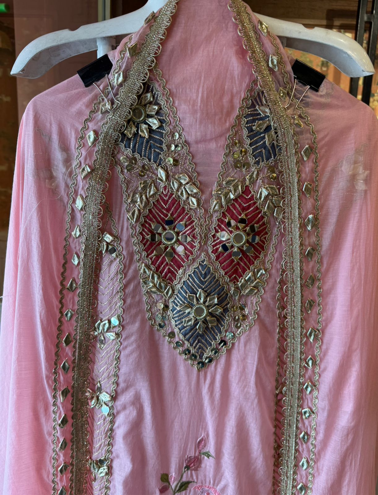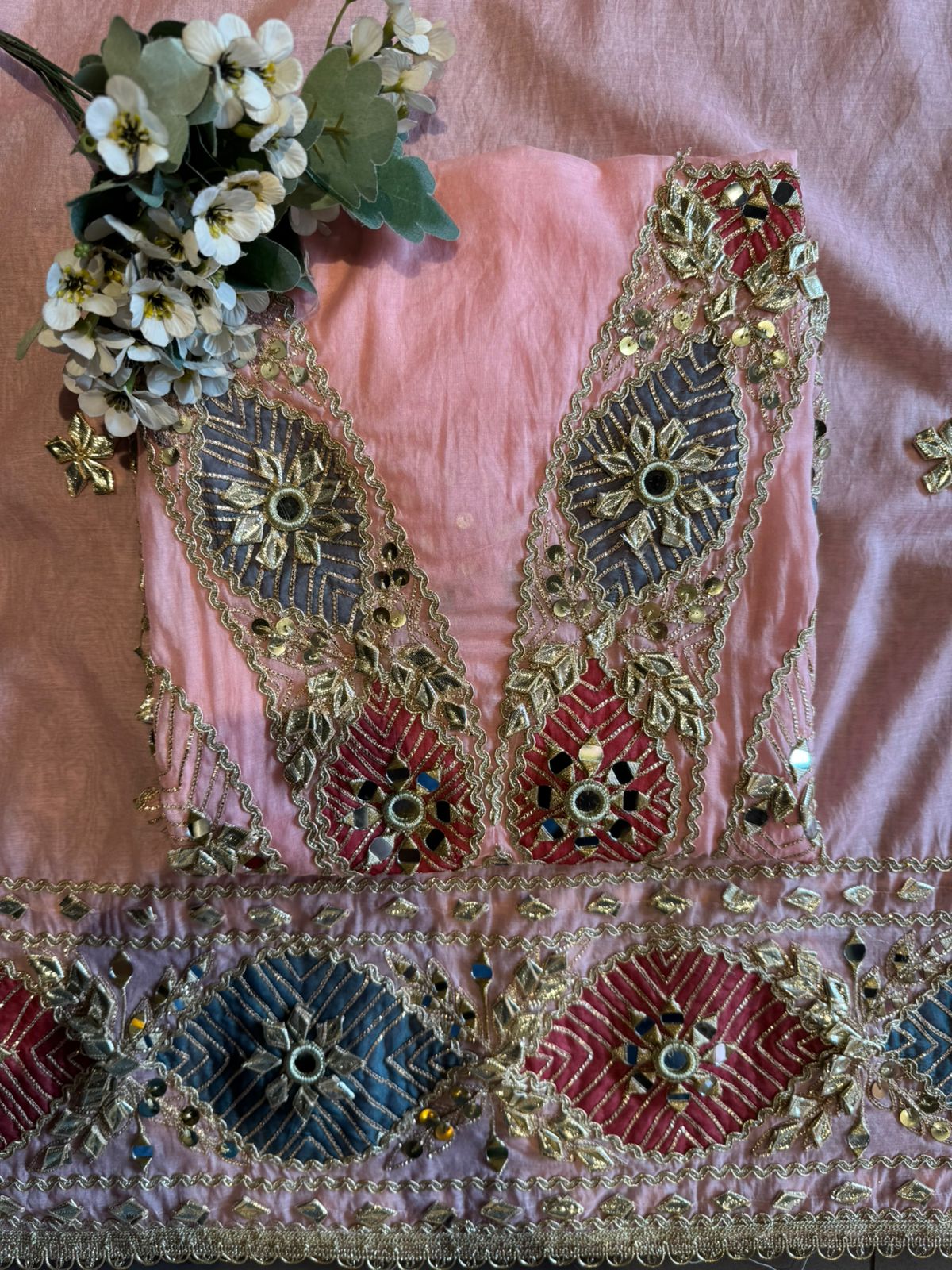 Embedded mirror (shisha) work at motif centers. Outlined with scalloped zari borders.